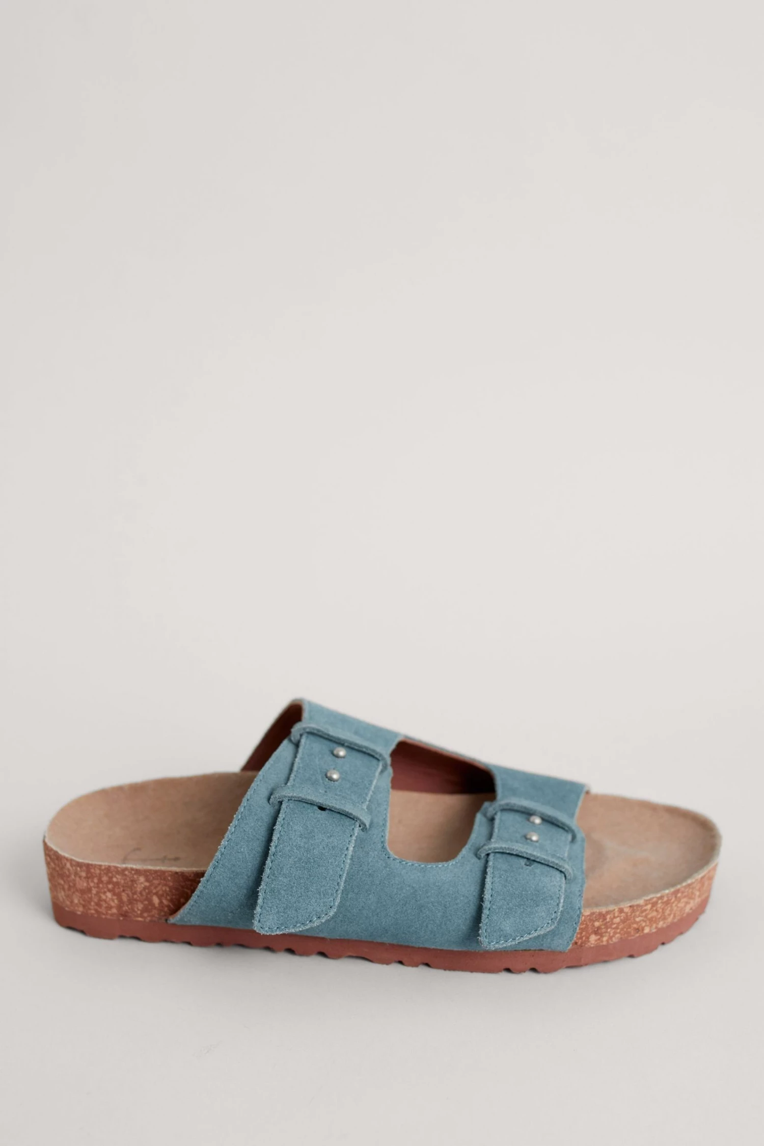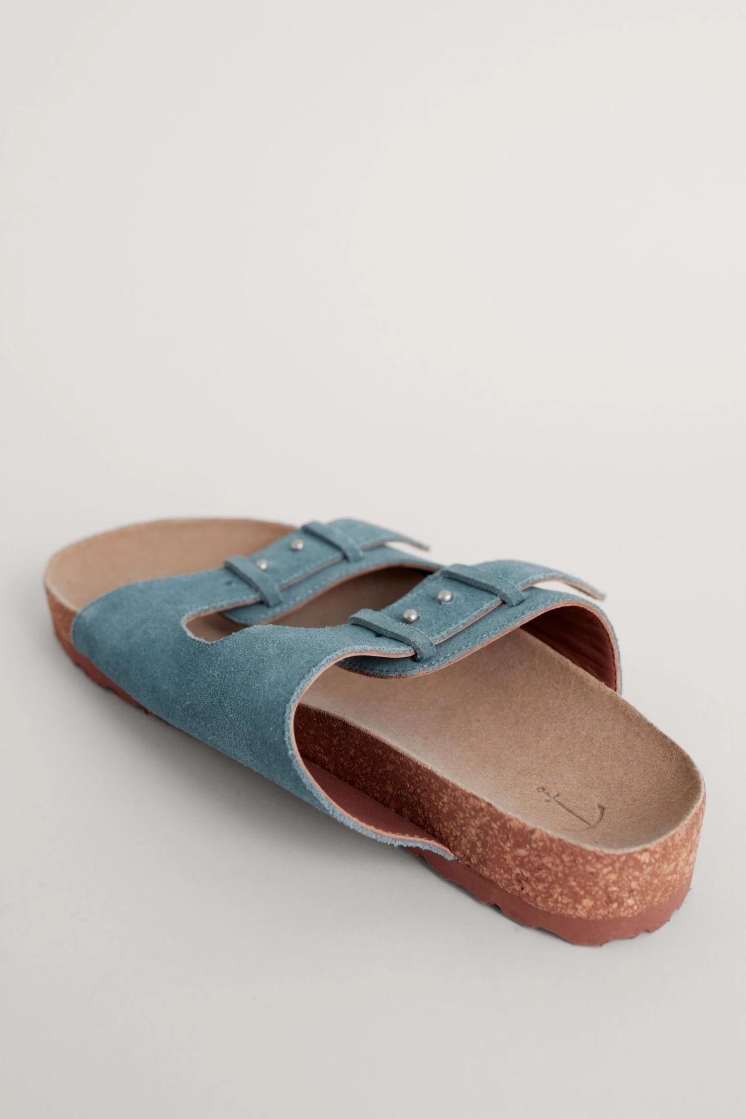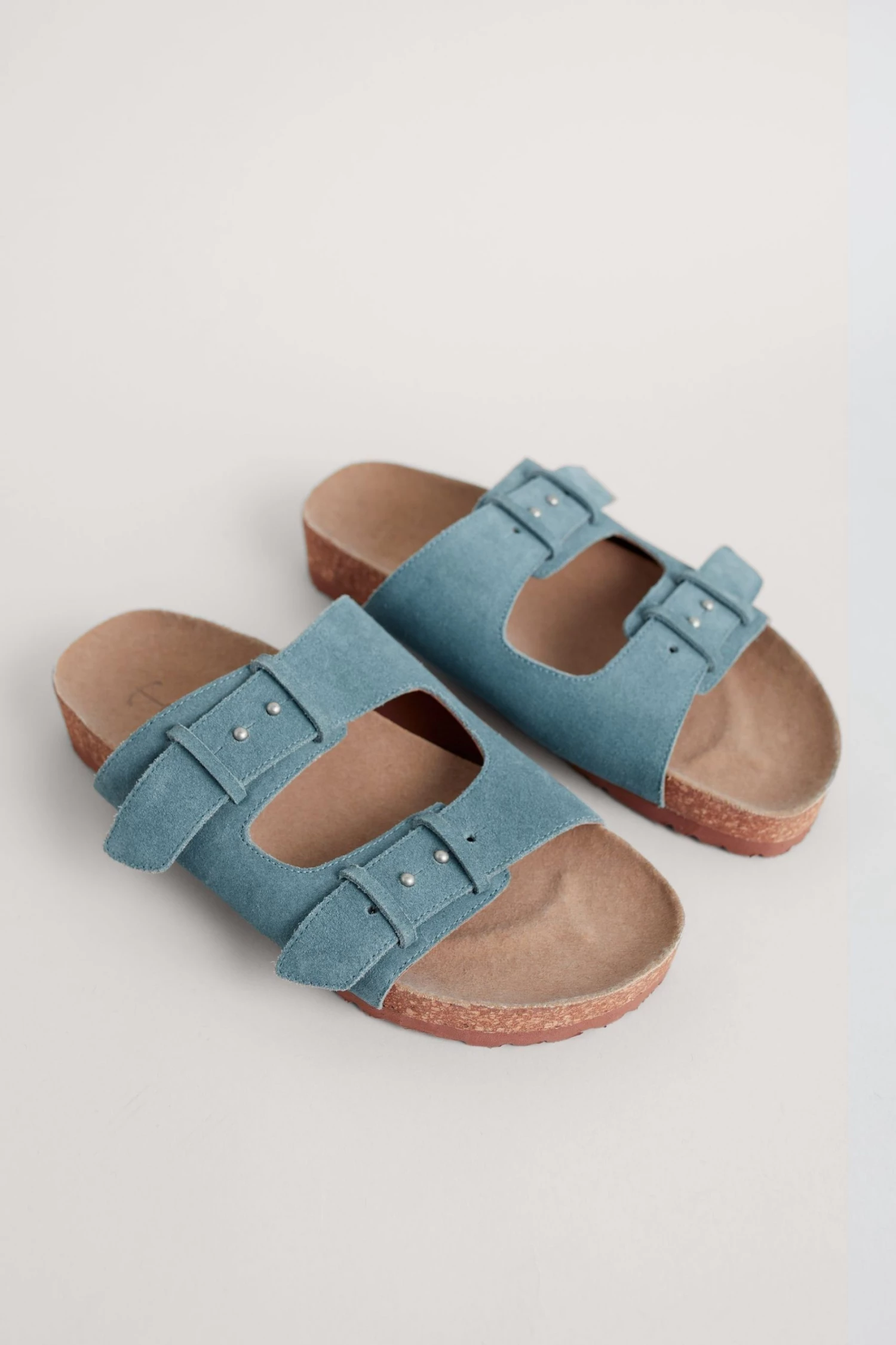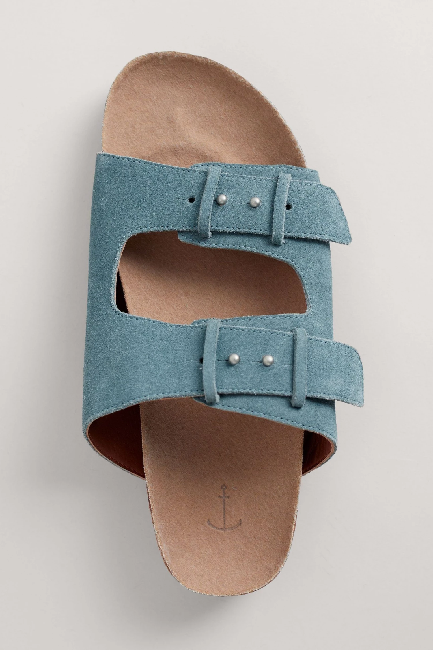 Stylish slip-on slider sandals with leather and brushed metal buckles.