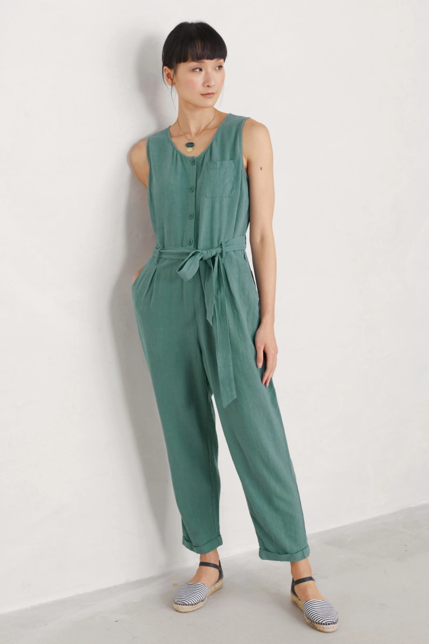 Sleeveless, button-front jumpsuit made from a cool and smooth blend of linen and viscose.