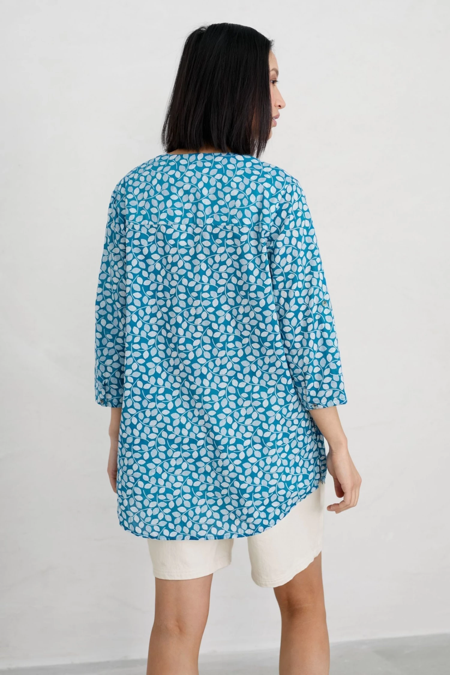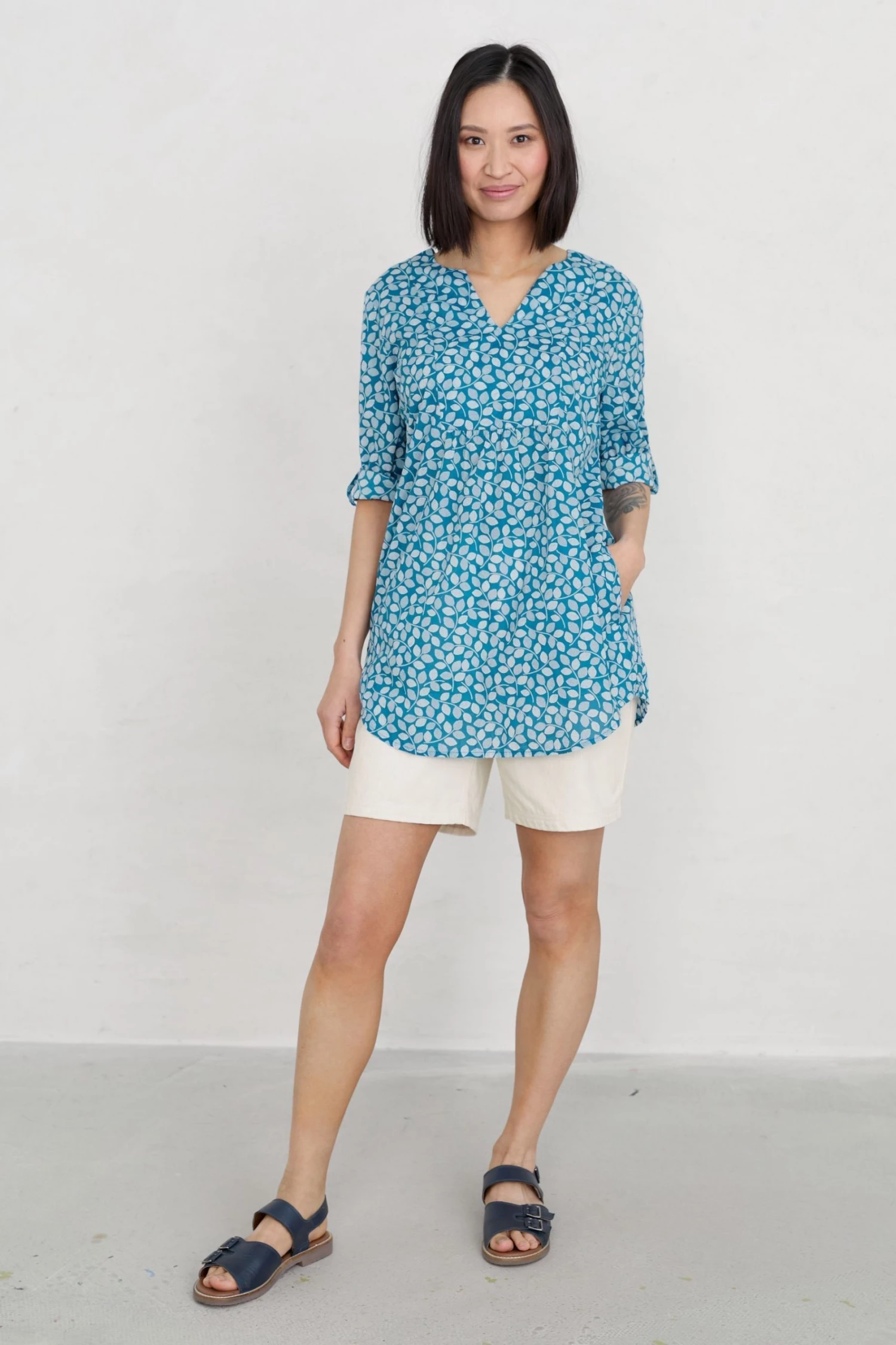 Organic cotton tunic top with in-seam pockets and roll-up sleeves, with a handcrafted print inspired by Cornwall.