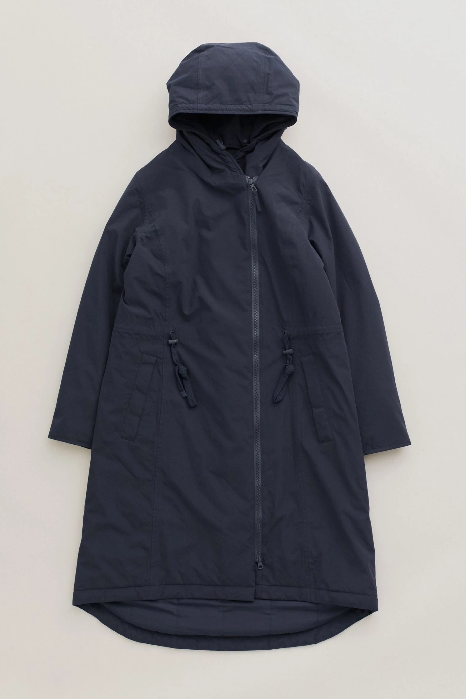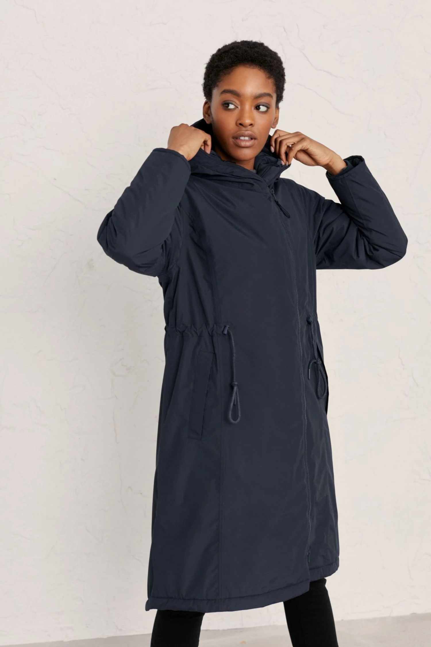 A parka-style coat that’s warm and waterproof. Made from Seasalt’s Tide Cycle® fabric, which is soft yet hardwearing, with a cosy quilted lining. Tide Cycle® uses recycled materials, taking less energy to make and reducing waste, like single use plastic, going to landfill. It has a wrap-over neckline and large hood, plus an internal drawcord so you can layer up and still get a snug fit. It has a zip fastening, ribbed cuffs with roll down sleeves, and handy pockets.