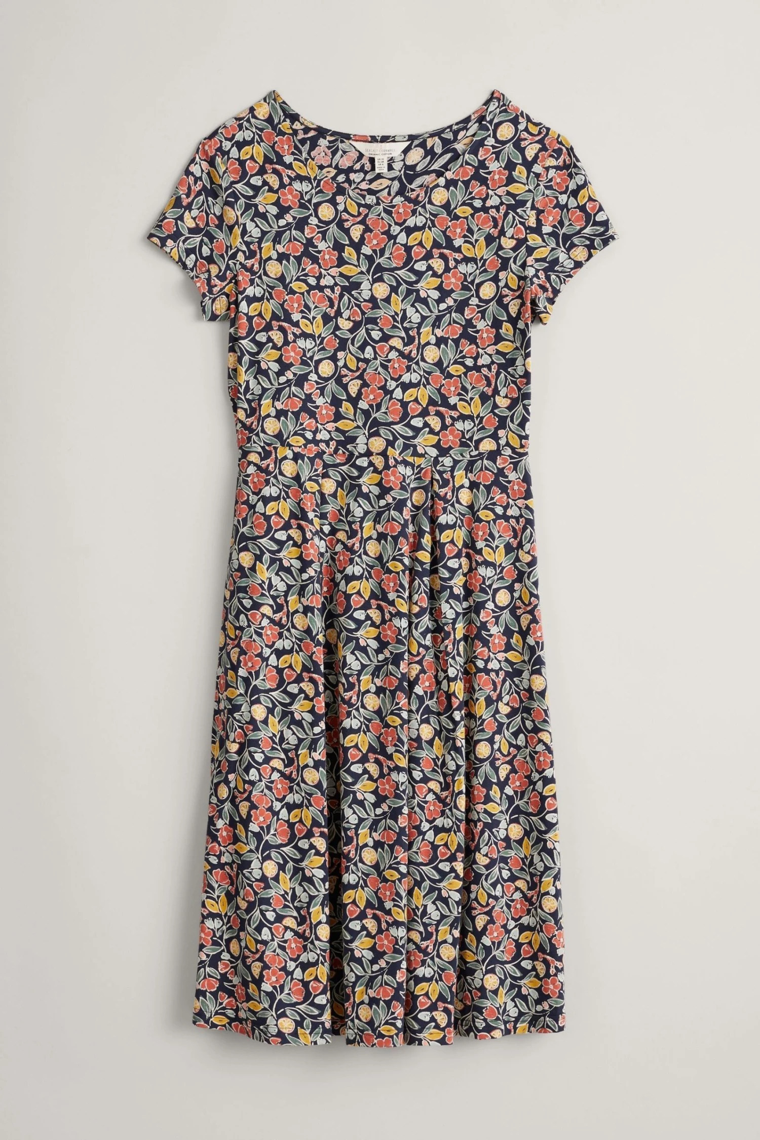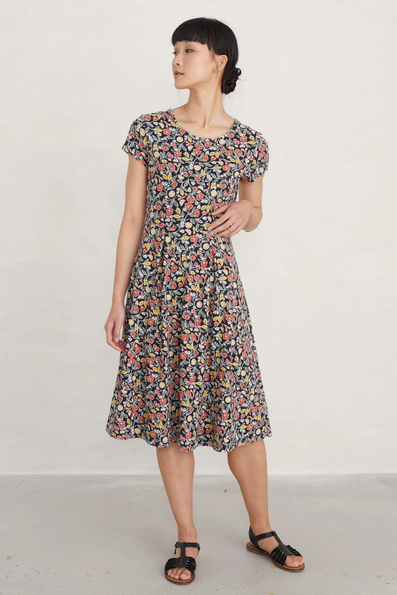 Fit-and-flare dress with scoop neck and cap sleeves in organic cotton jersey with stretch.