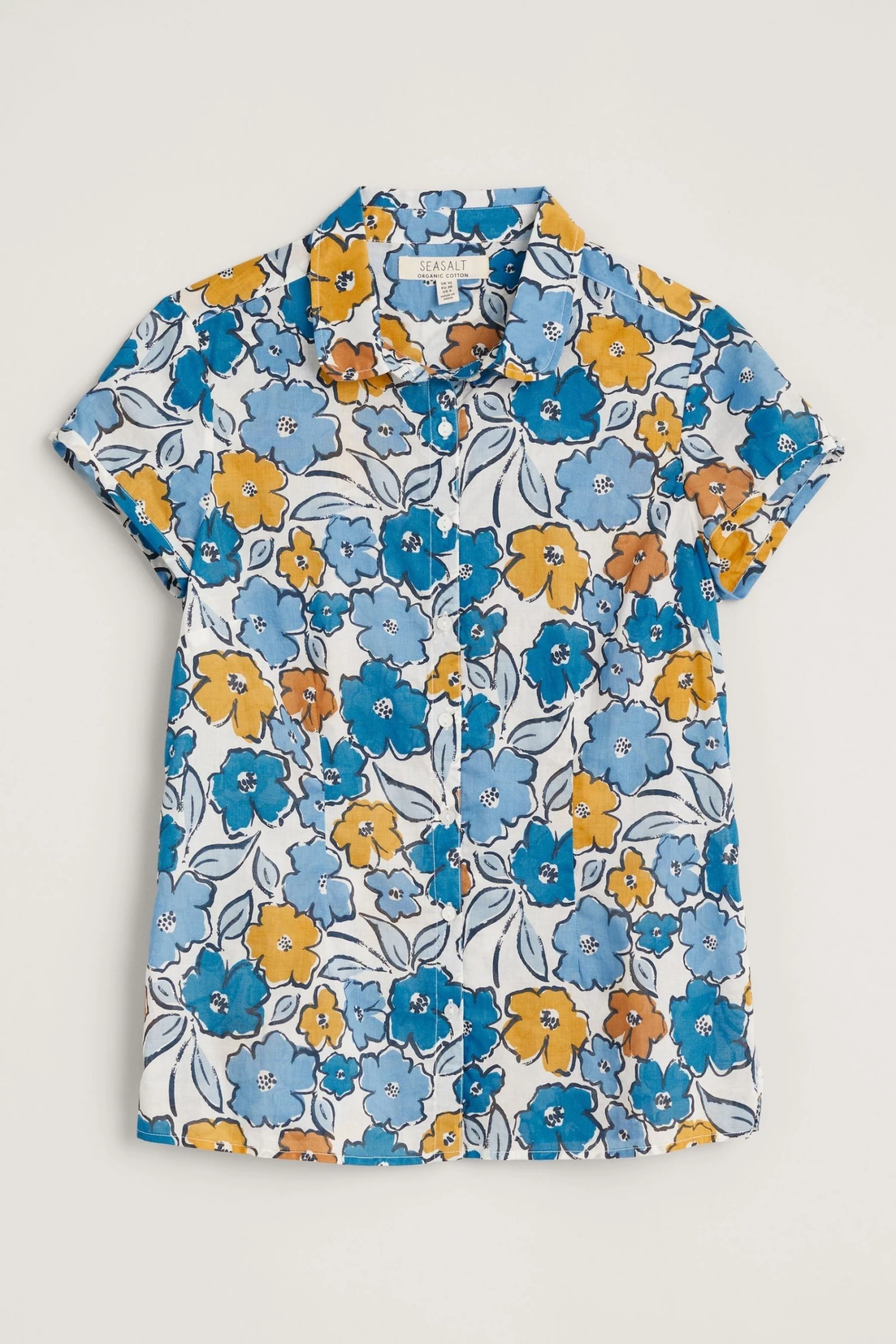 Semi-fitted cap sleeve shirt with Seasalt print in cotton voile.