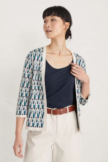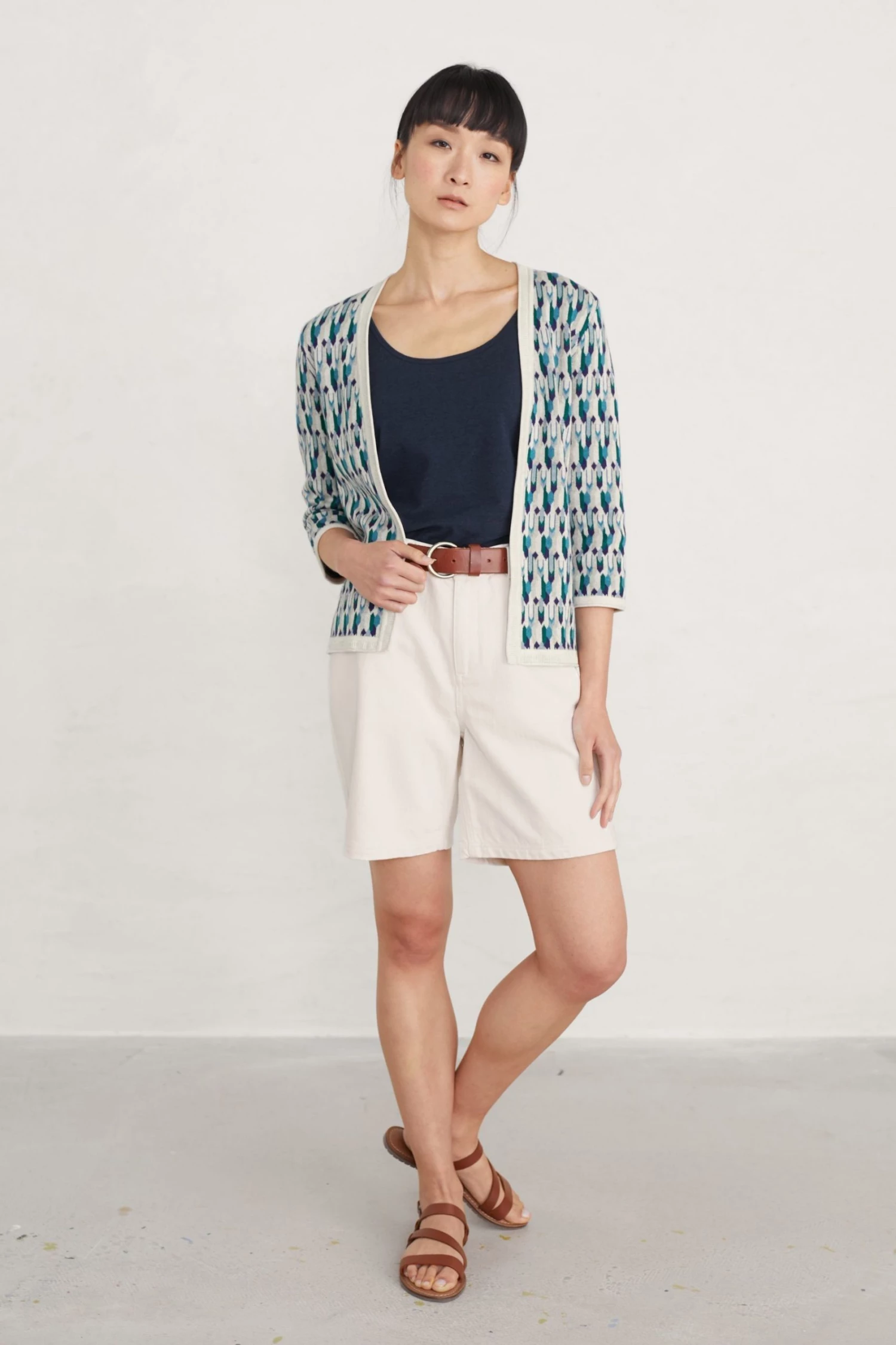 A statement summer cardigan with a geometric pattern in easy-to-style colours, with 3/4th sleeves and rolled edges.