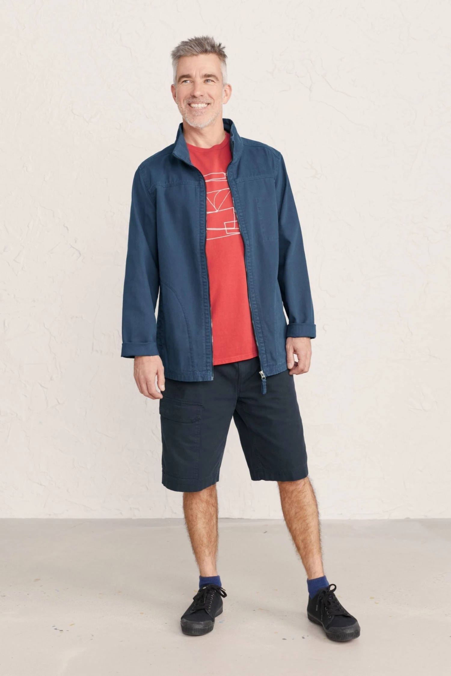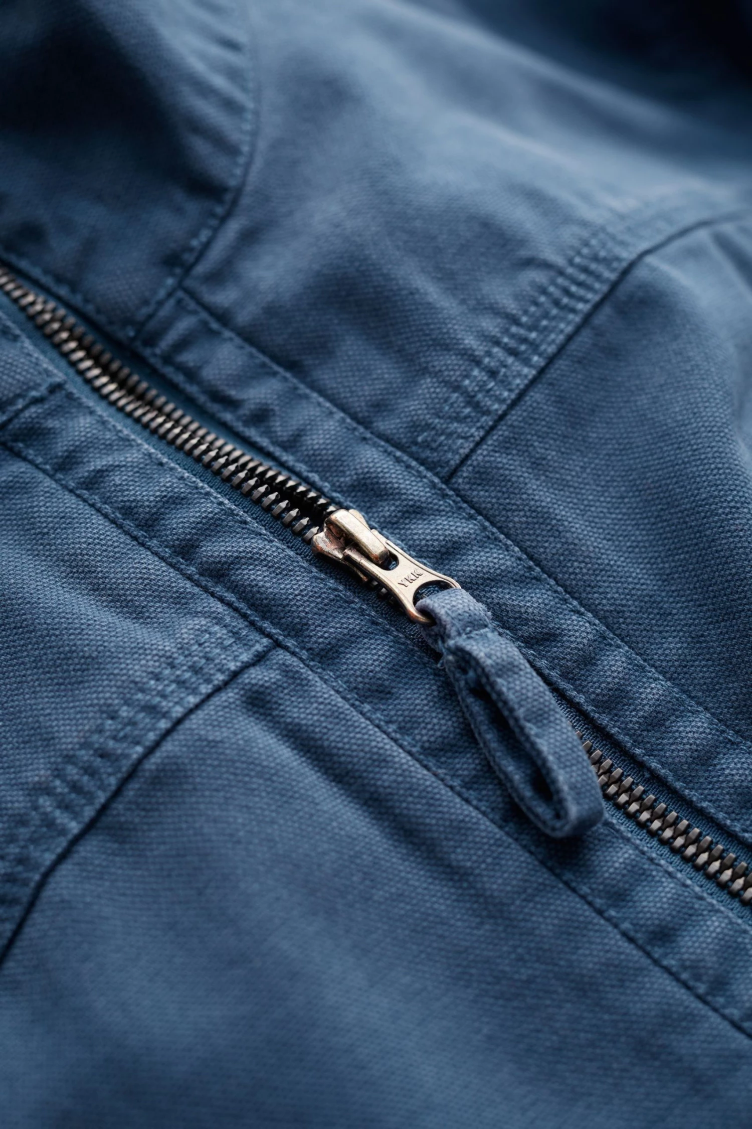 Zip-up jacket with high collar in durable cotton, designed in Cornwall and inspired by fishermen’s smocks.