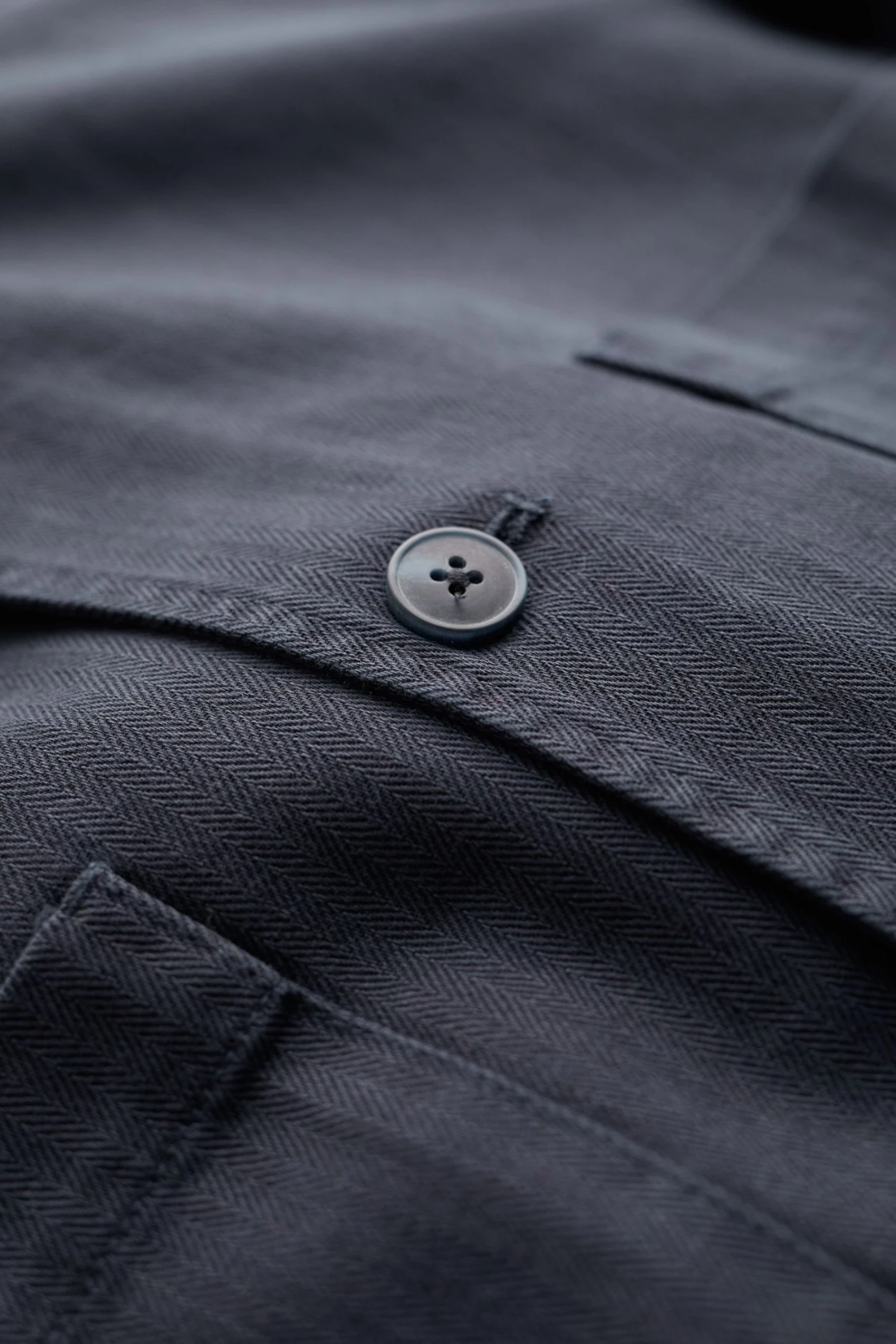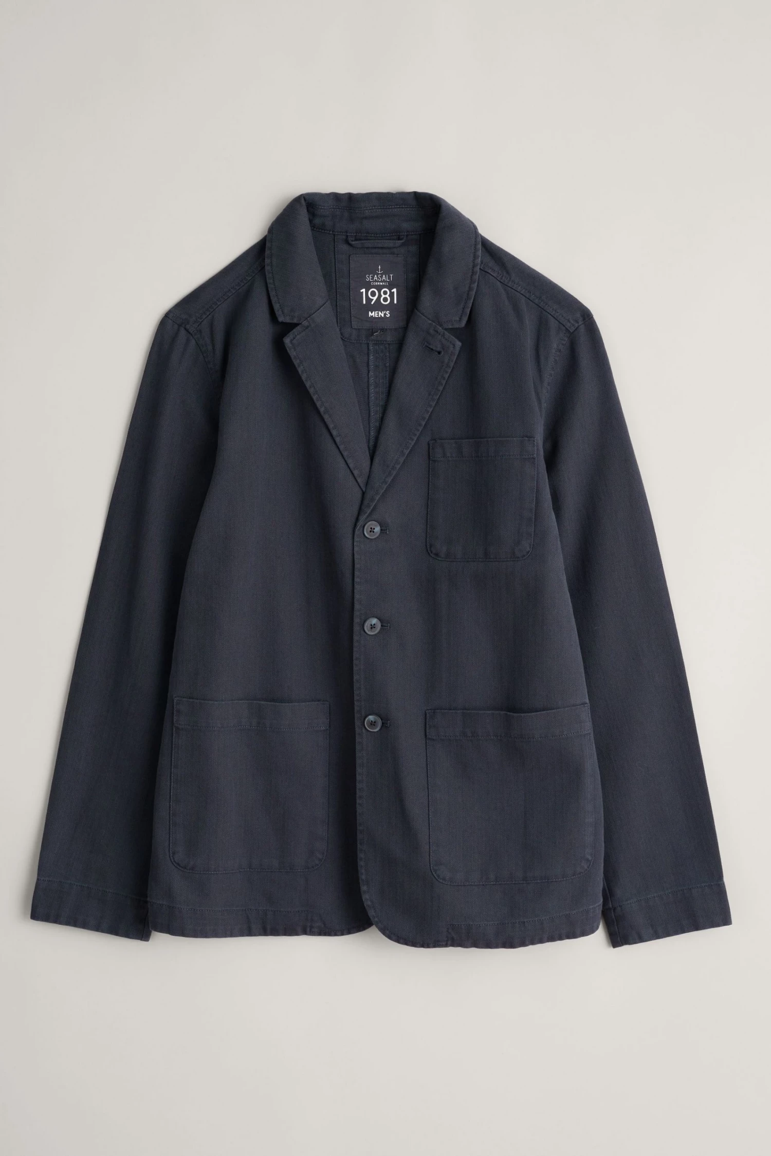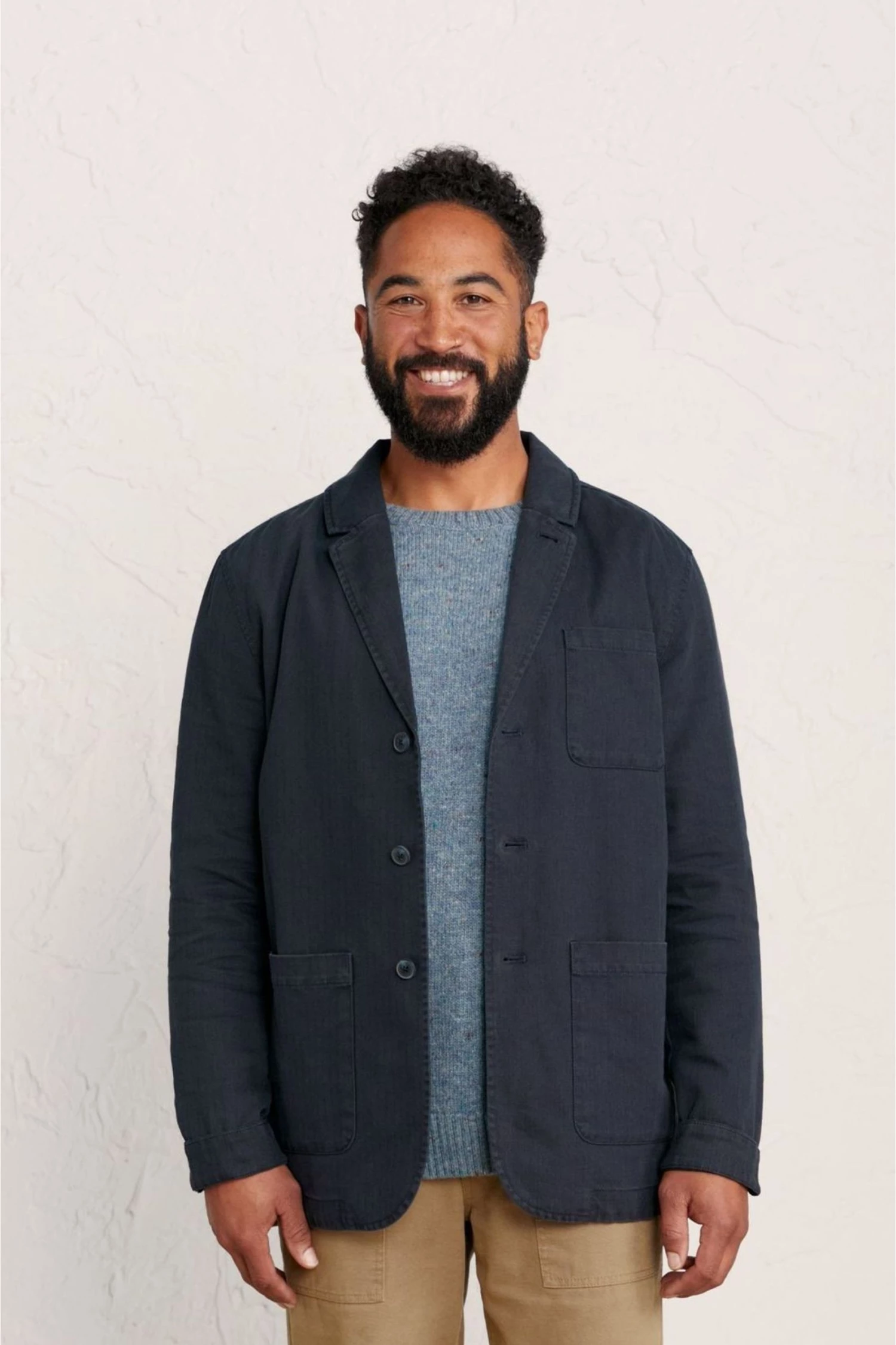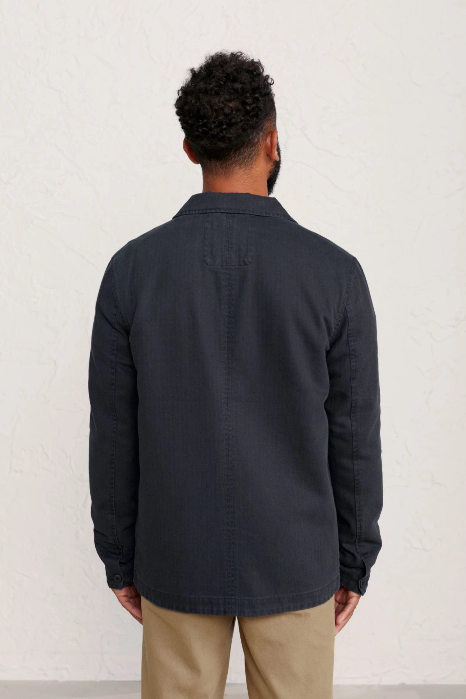 Workwear-style casual blazer jacket, with a herringbone texture and plenty of pockets.