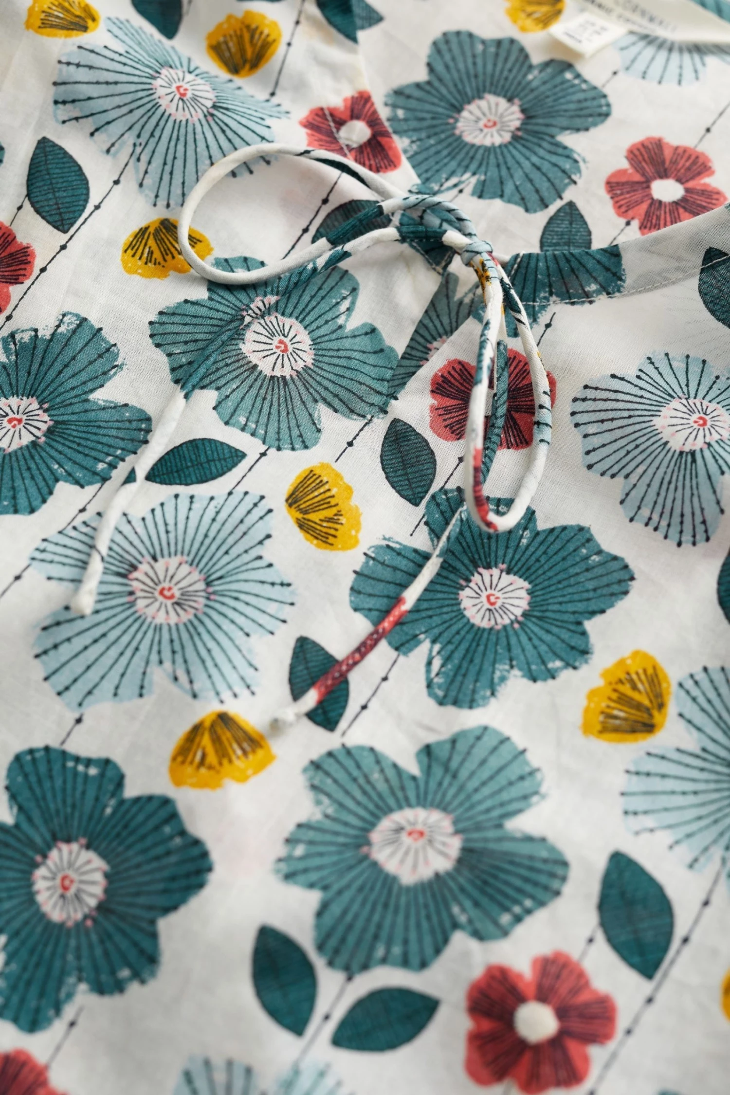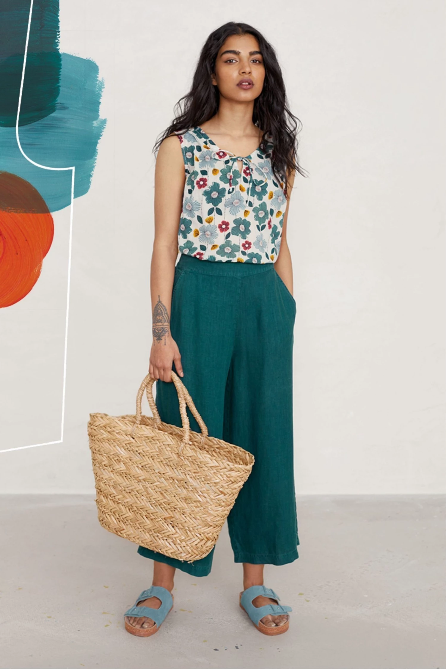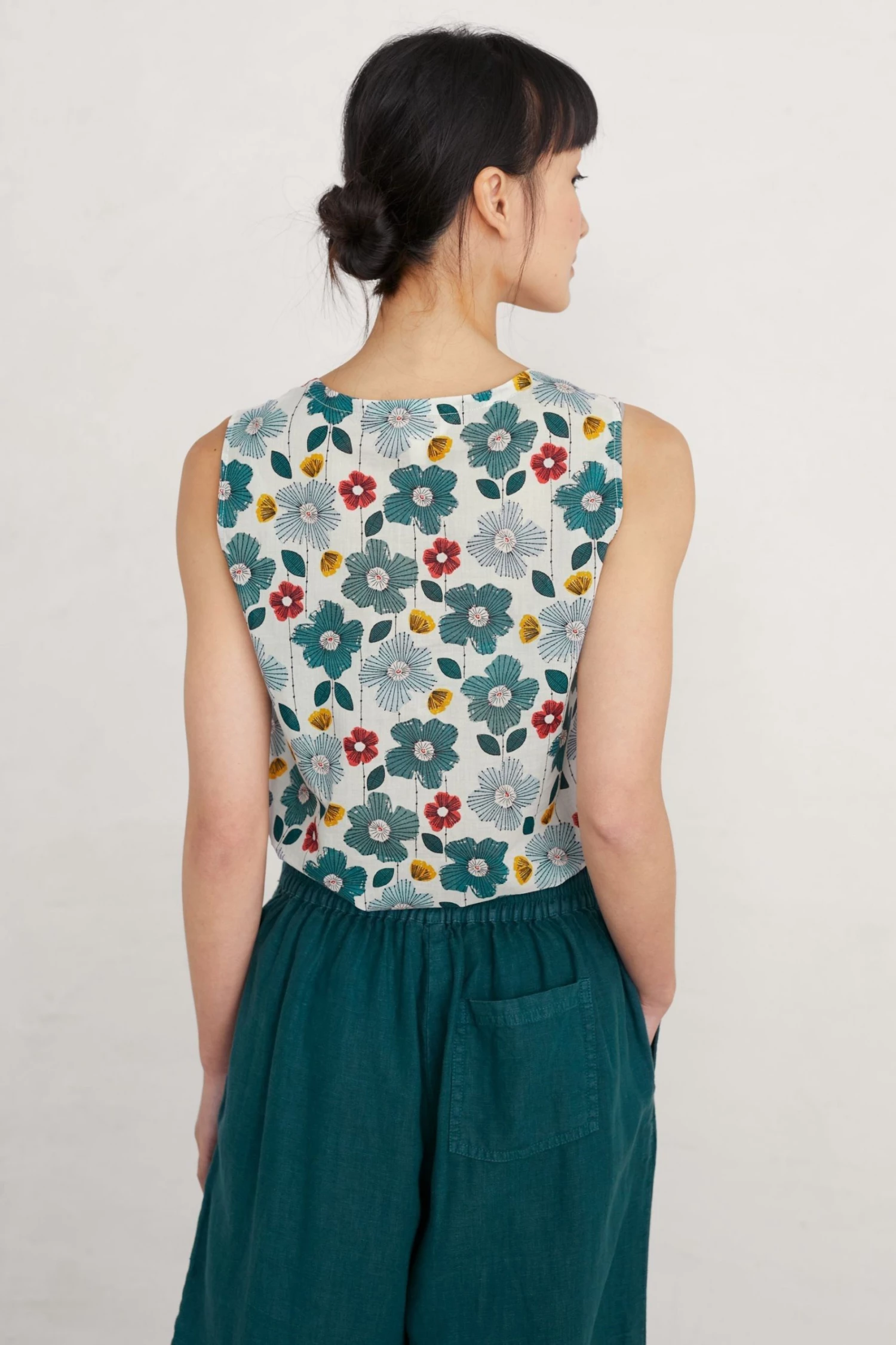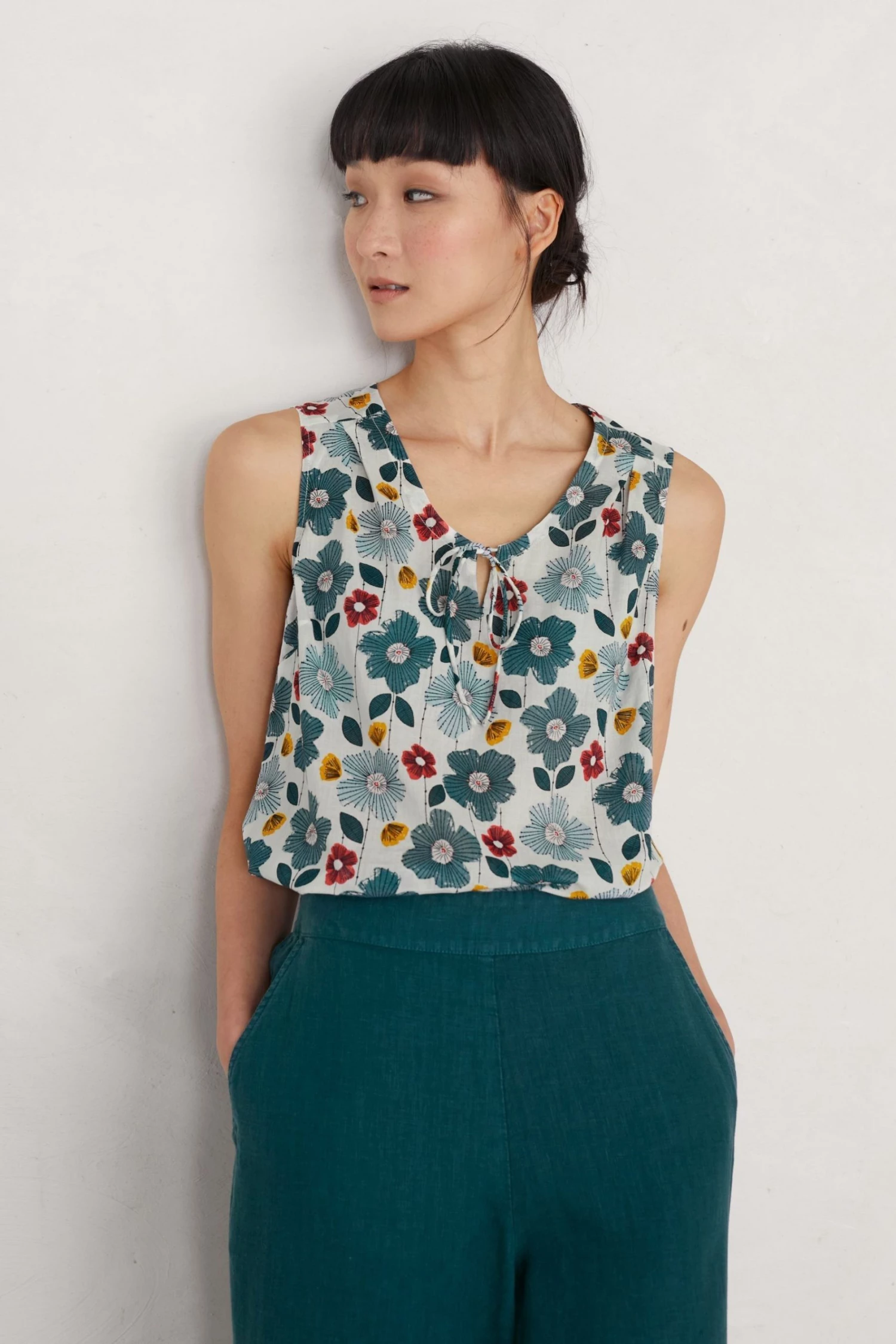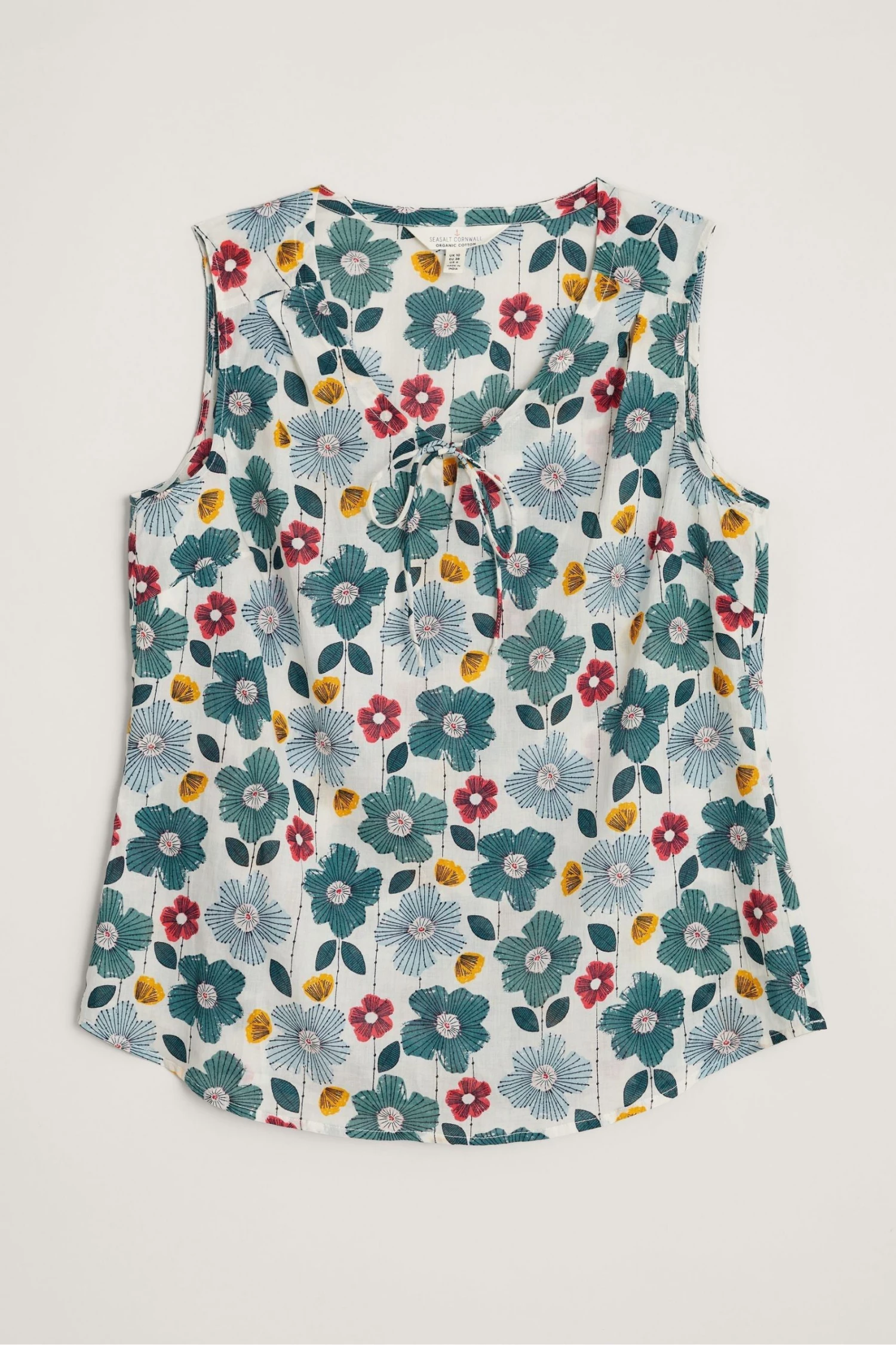 Cool and easy sleeveless printed summer top. The V-neck has a keyhole detail with fine rouleau ties.