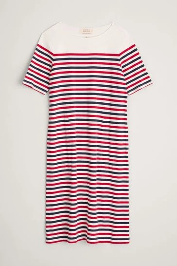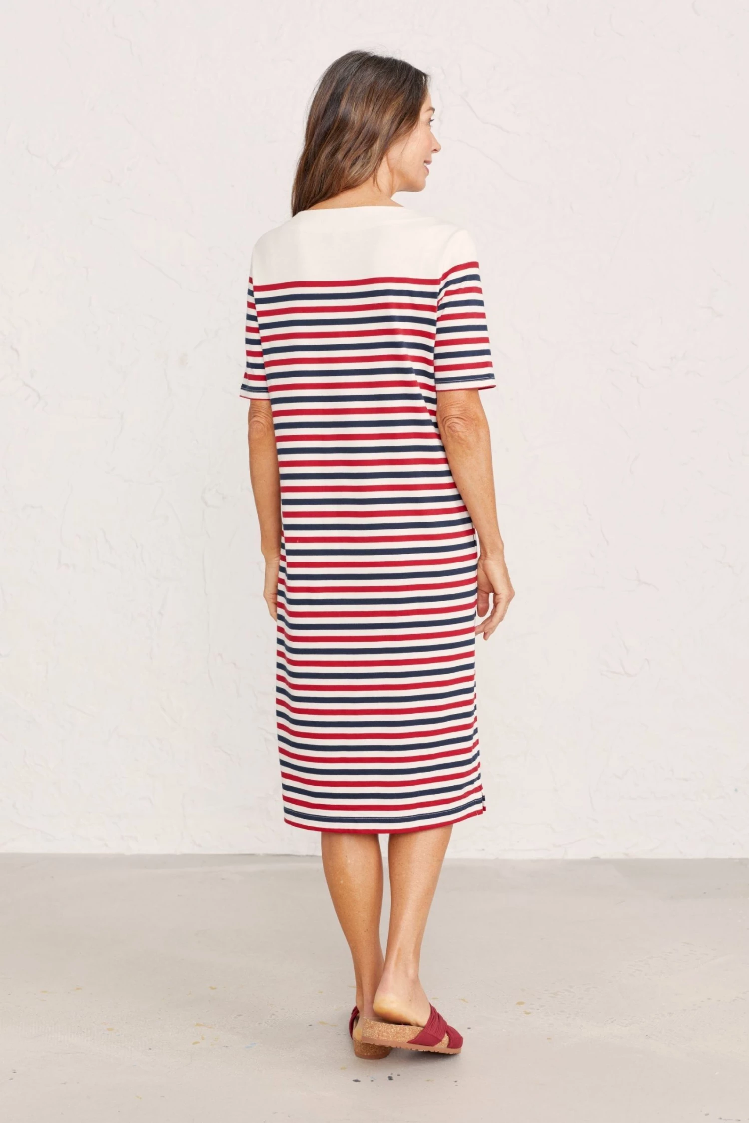Soft jersey midi dress made from breathable organic cotton, with vibrant stripes inspired by Cornwall’s coast.