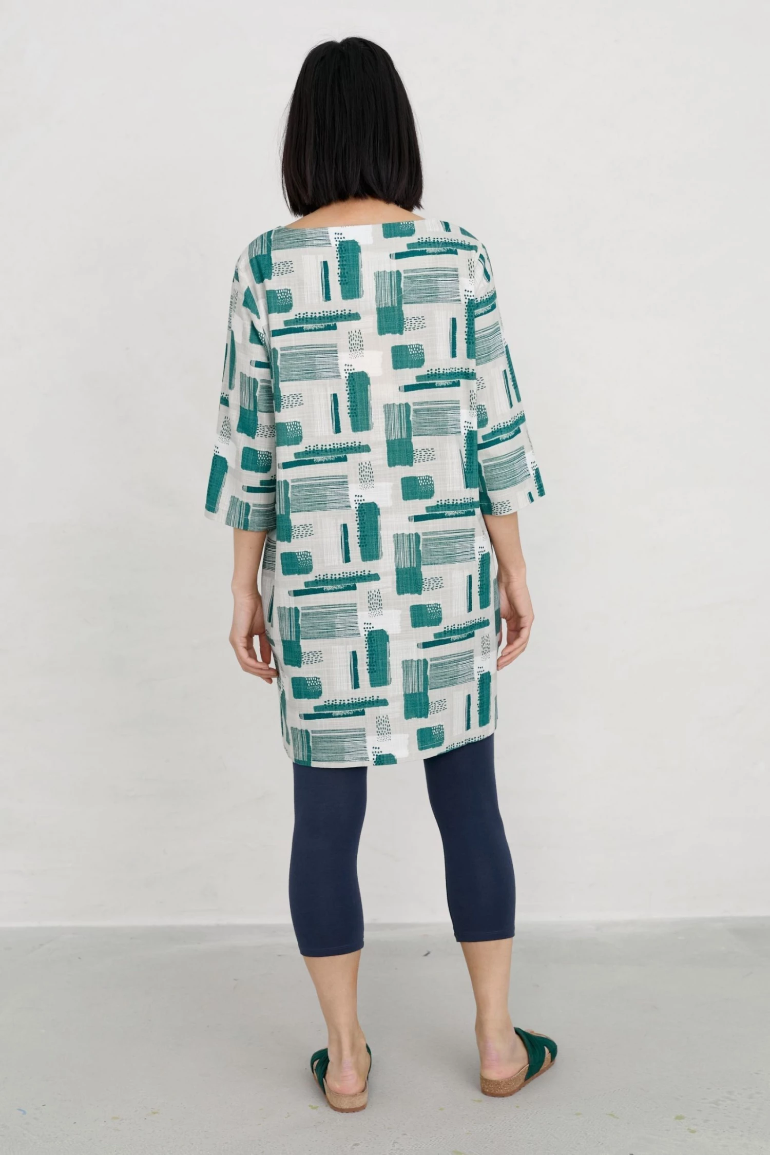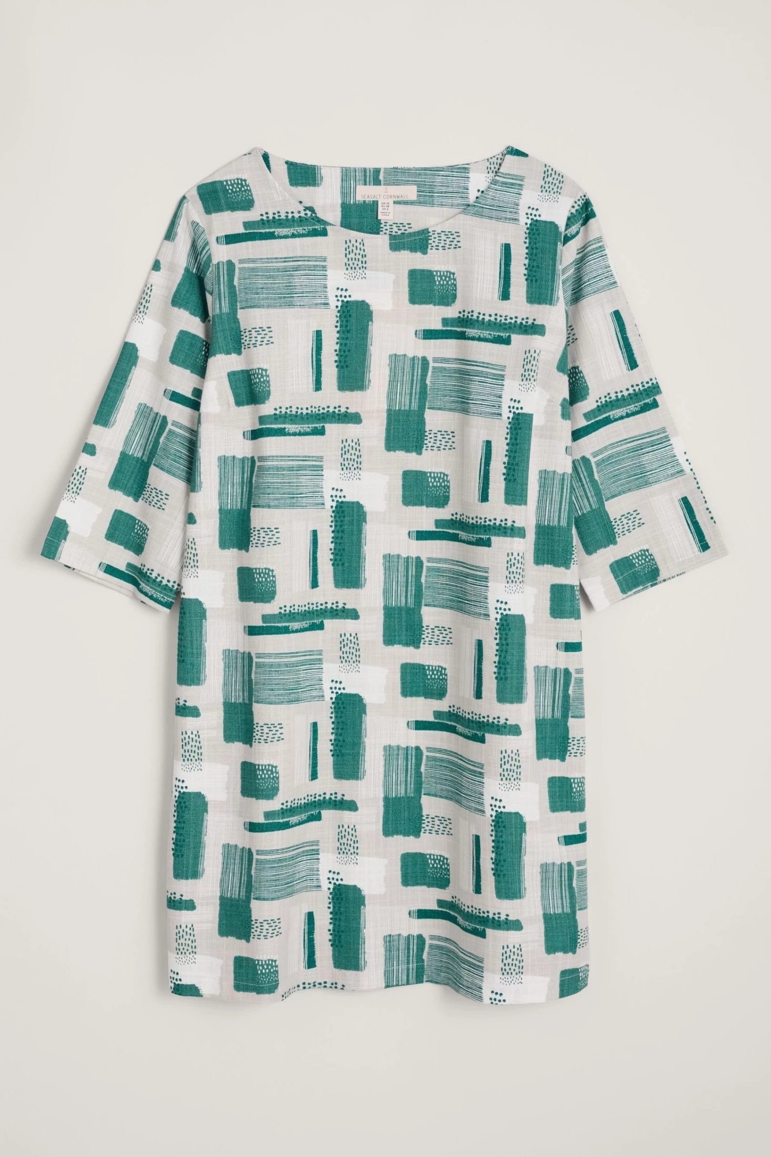 Cocoon tunic with integral pockets and a round neck, perfect for layering. With a handcrafted print inspired by Cornwall.