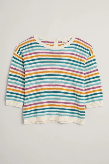 Relaxed fit cotton linen jumper with bright stripes, 3/4th sleeves and rib detailing.