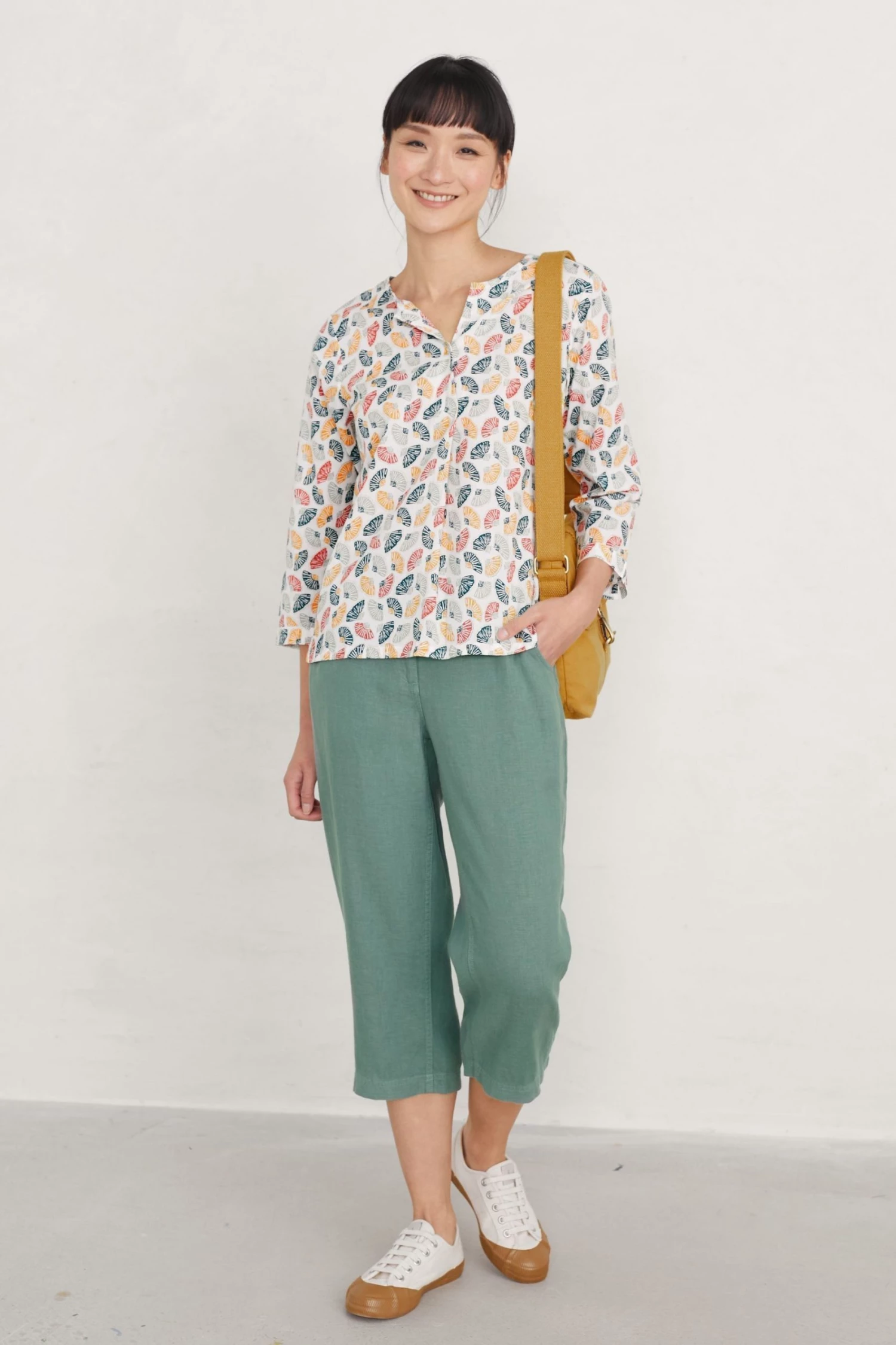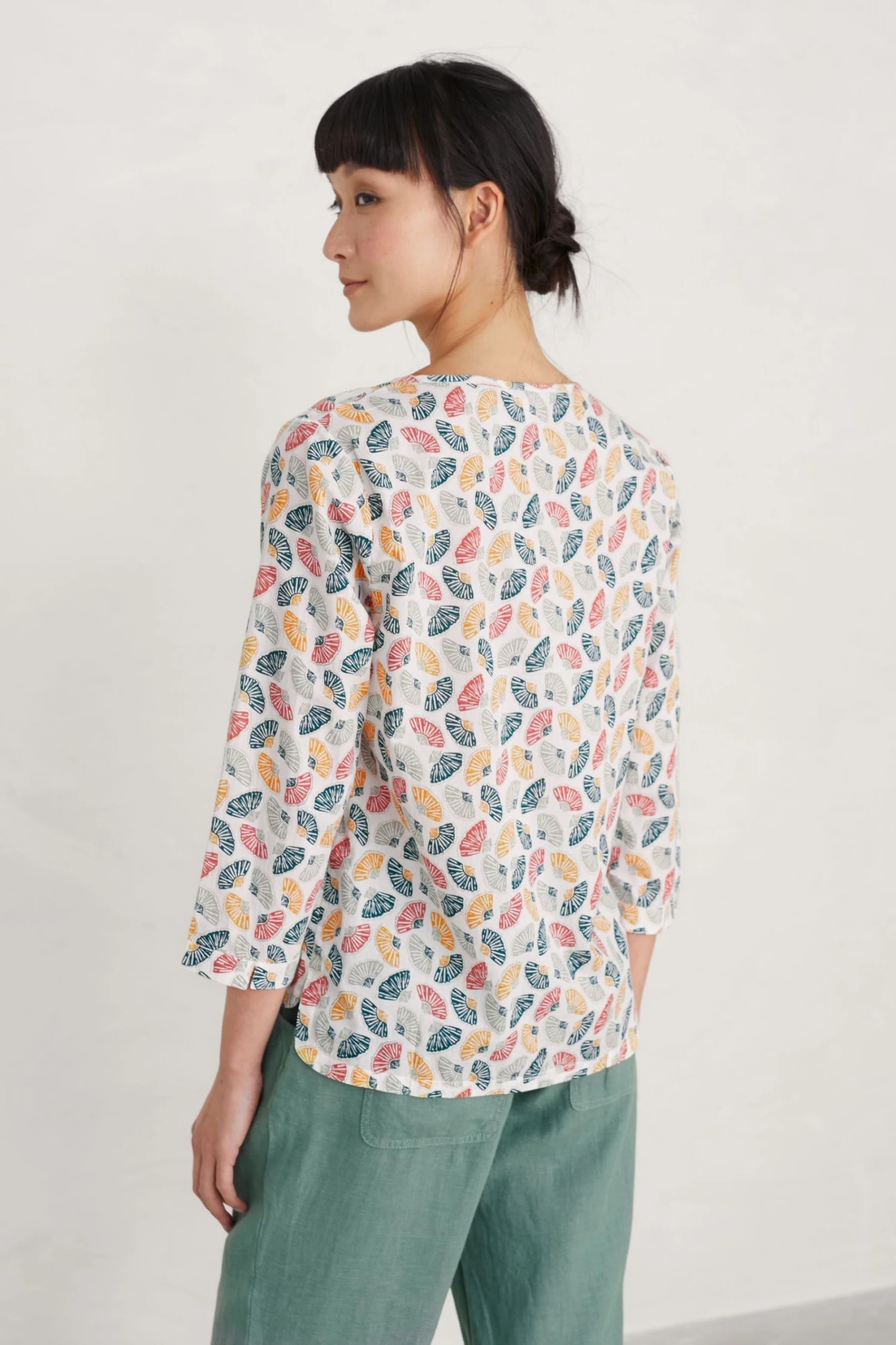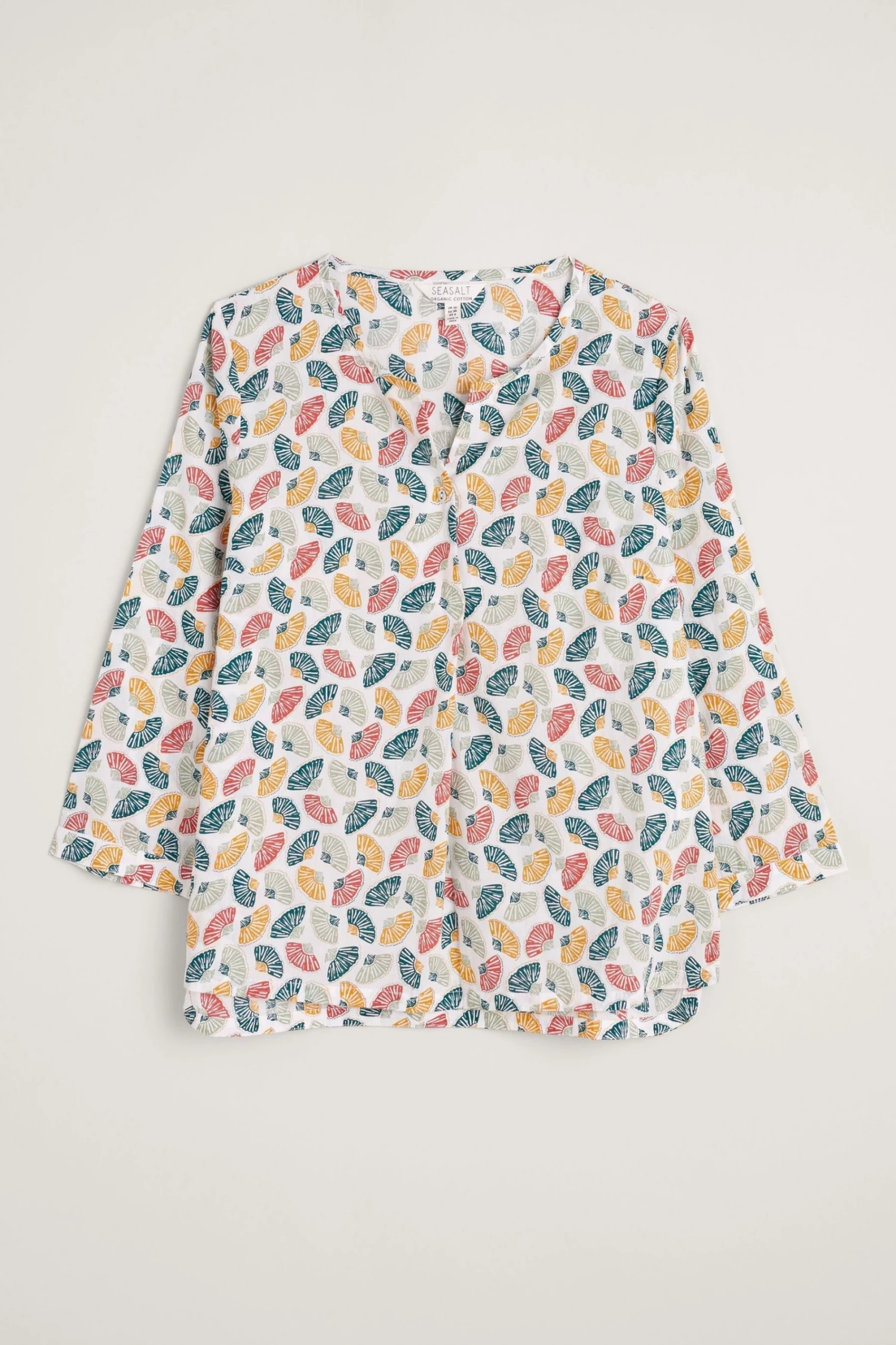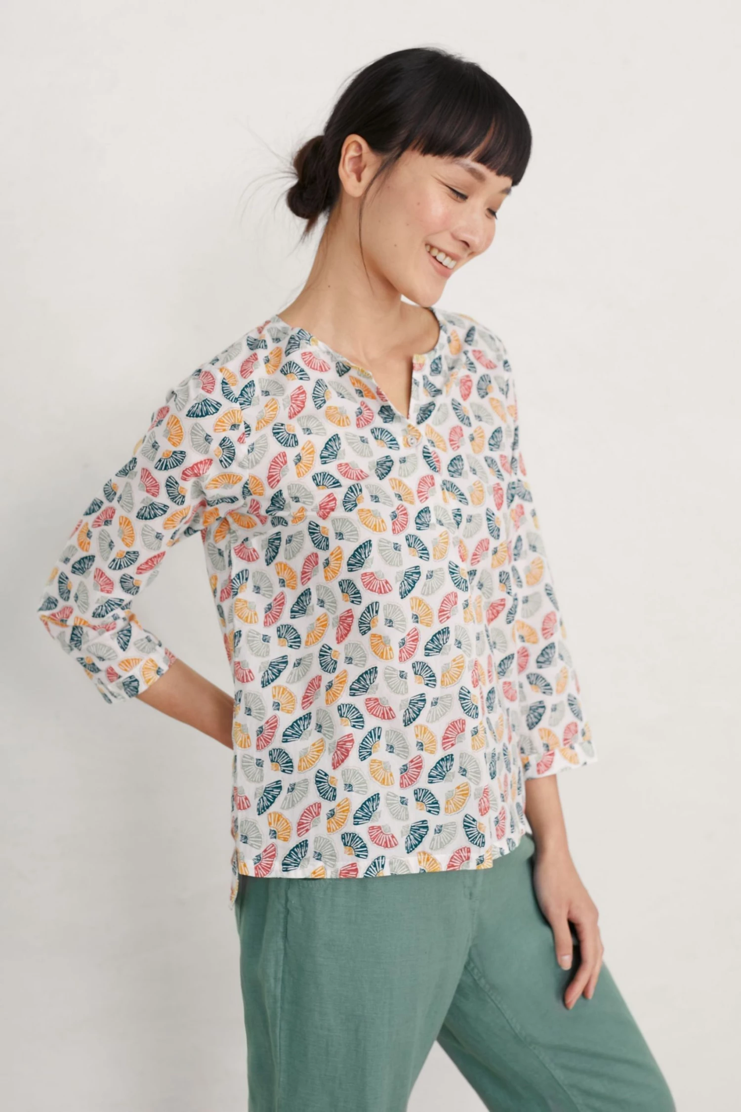 A cotton top with a handcrafted Seasalt print. It has a relaxed fit, 3/4th length sleeves and a curved hemline that’s lovely over trousers. The cross-over notch neckline features a little button detail.