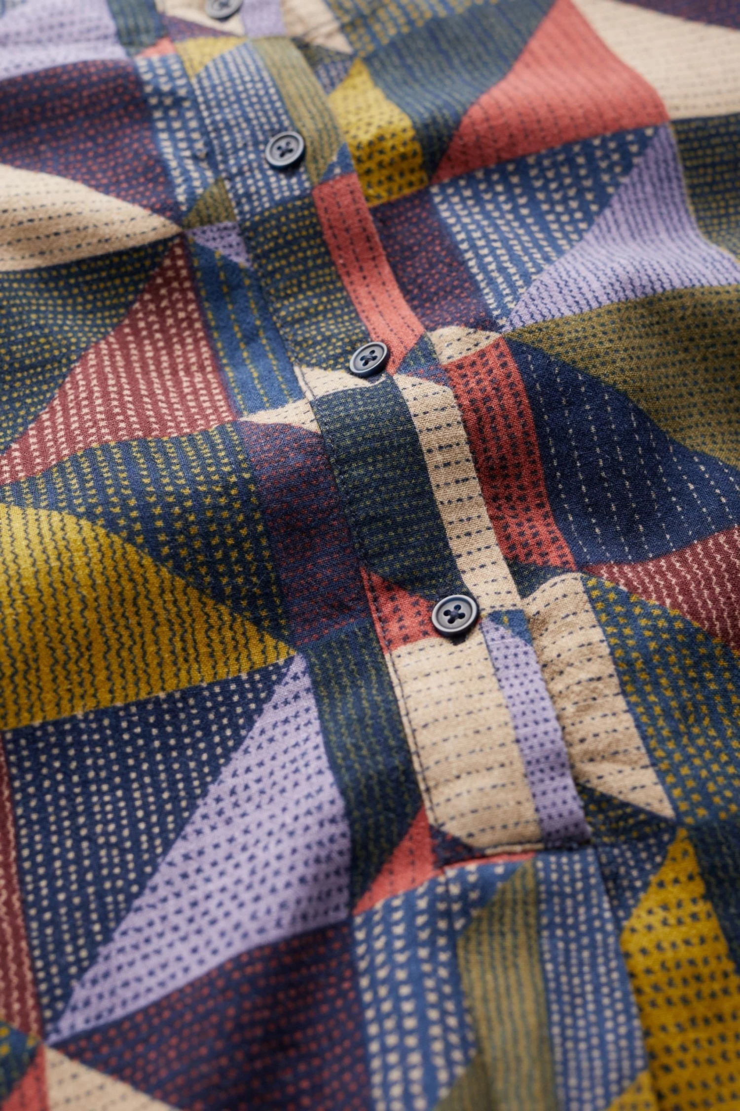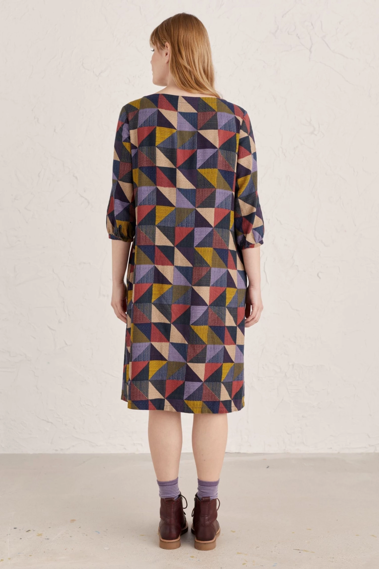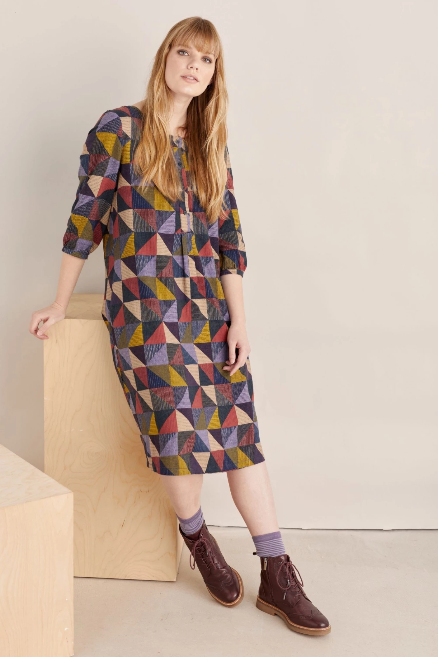 An A-line dress made from a linen blend with button-up front and 3/4 length sleeves. Falls below the knee.