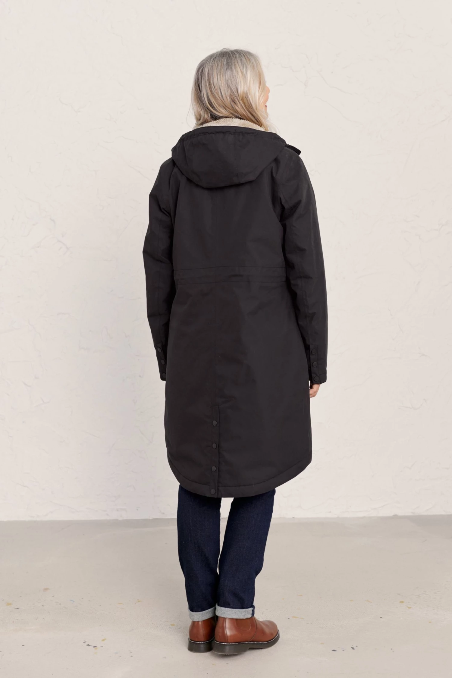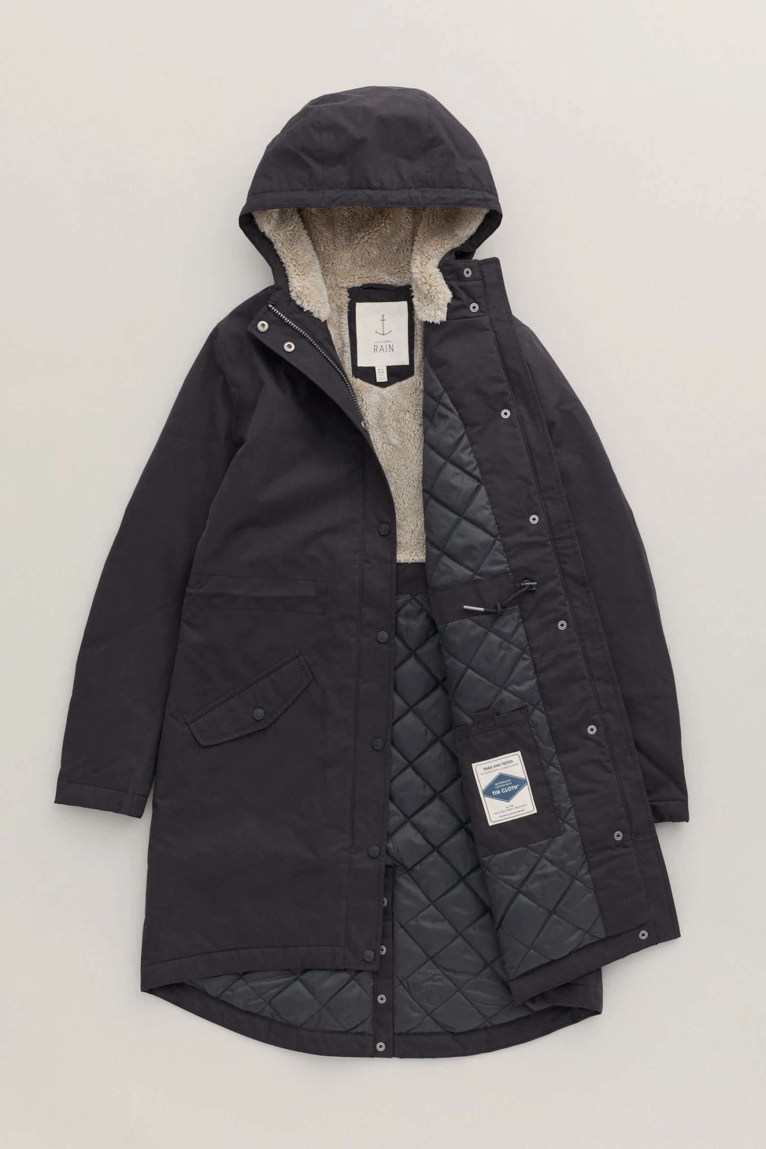 A ready for anything coat made from a waterproof blend of organic cotton and recycled nylon, with a soft finish inspired by traditional fishermen’s oilskins. It has a feminine but relaxed fit perfect for layering, with a fleece-lined top body and hood and cosy quilted lower body. With cuffs you can roll up or down, a two-way zip snap fastening and poppered pockets, it’s been tested against the worst Cornish weather.