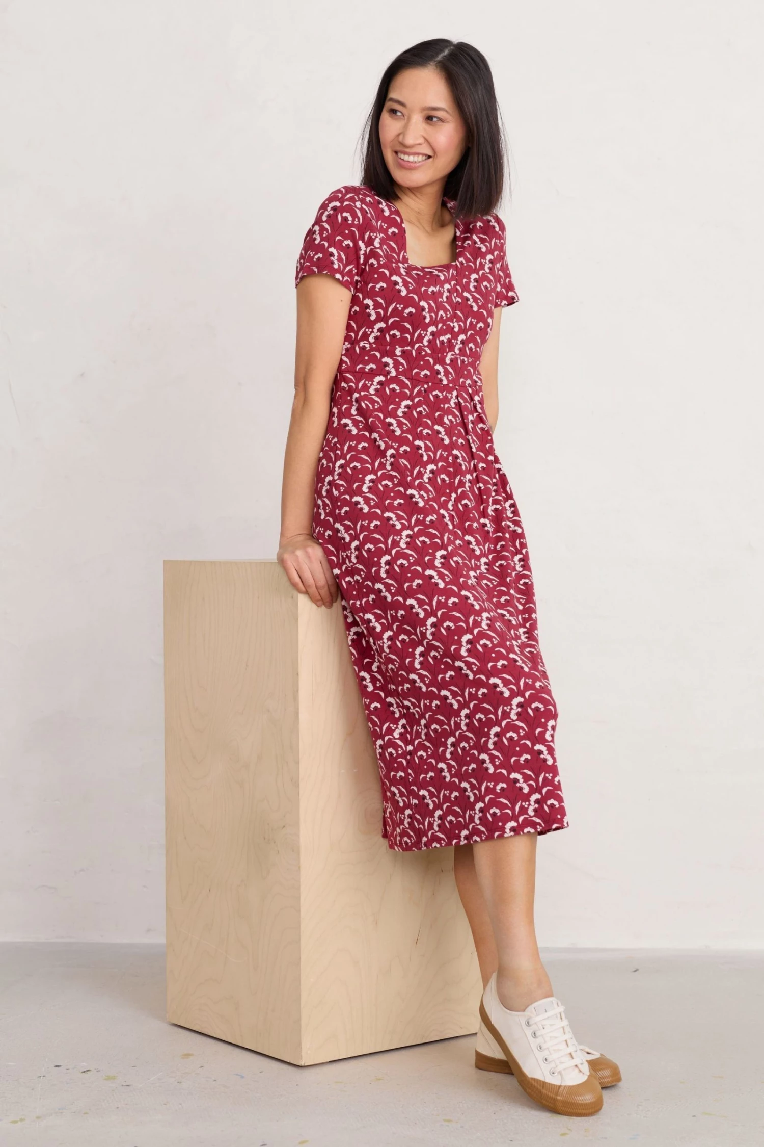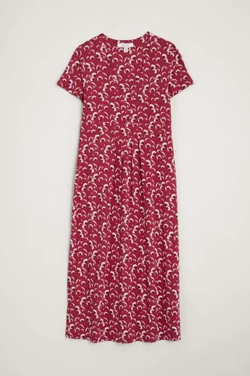 A flattering, suits-all midi dress with short sleeves, an under-bust band and a deep, feminine V-neck with extra panel for good coverage. Made from a soft bamboo jersey, it drapes beautifully.
