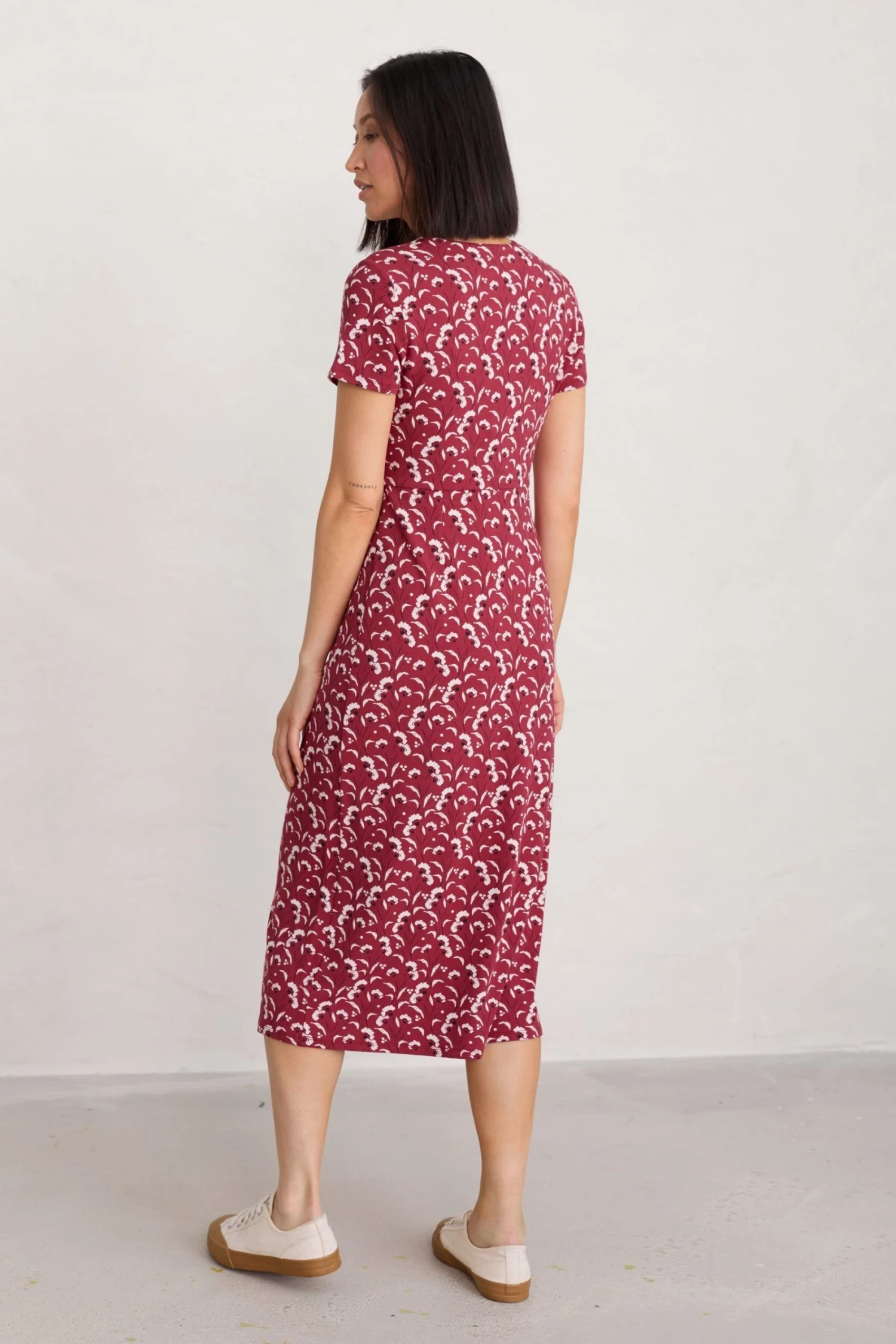 A flattering, suits-all midi dress with short sleeves, an under-bust band and a deep, feminine V-neck with extra panel for good coverage. Made from a soft bamboo jersey, it drapes beautifully.