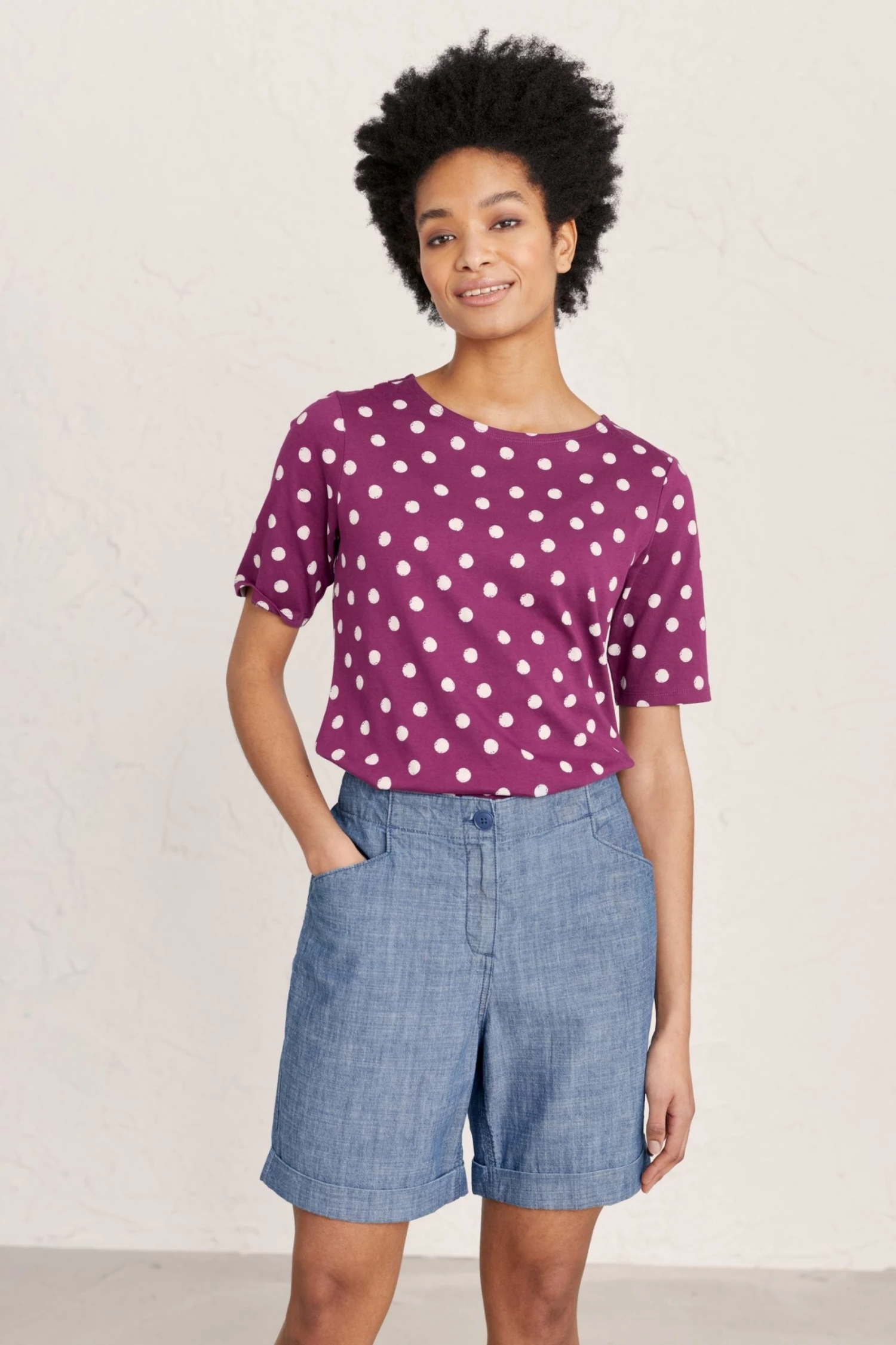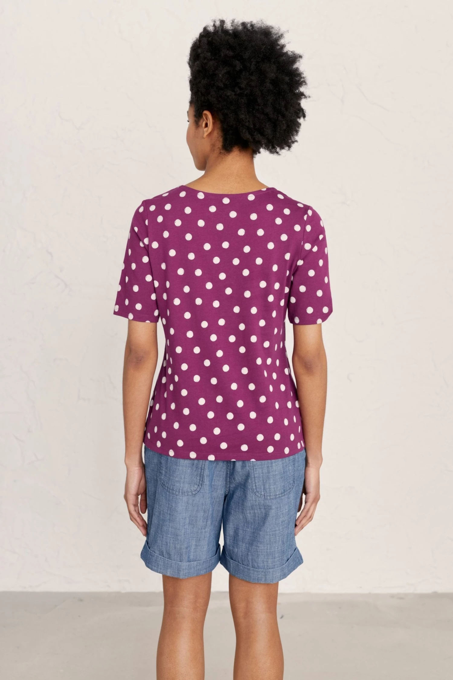 Neat fit organic cotton jersey top with half sleeves and boat neck.