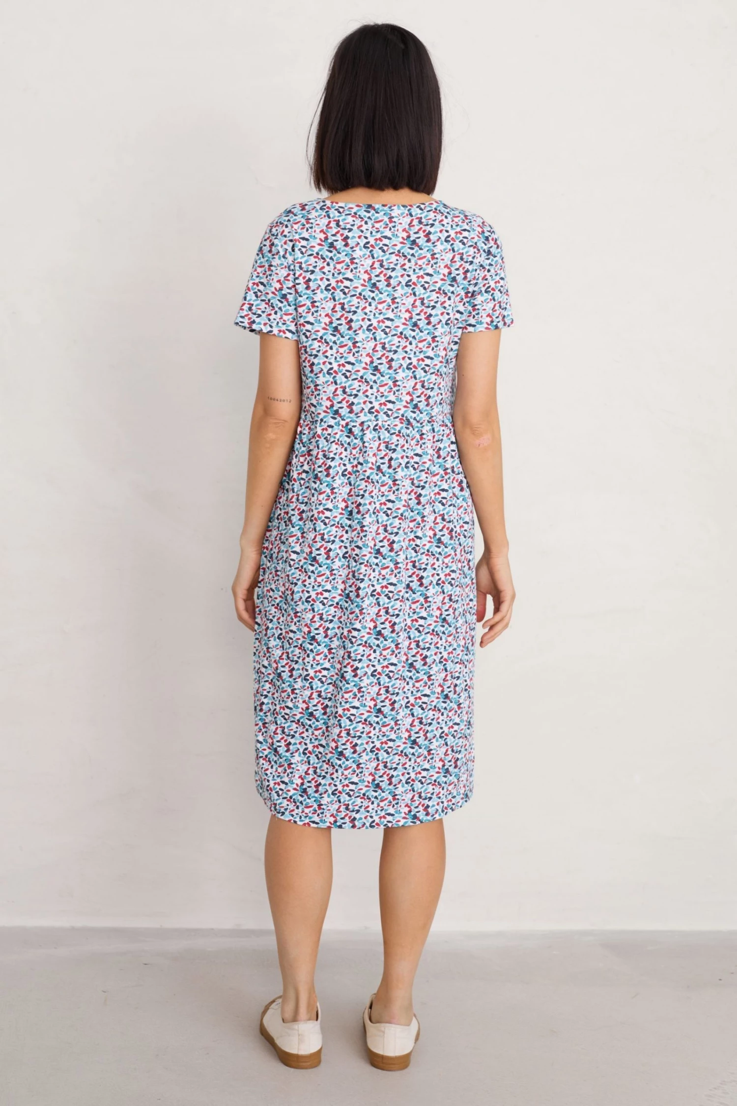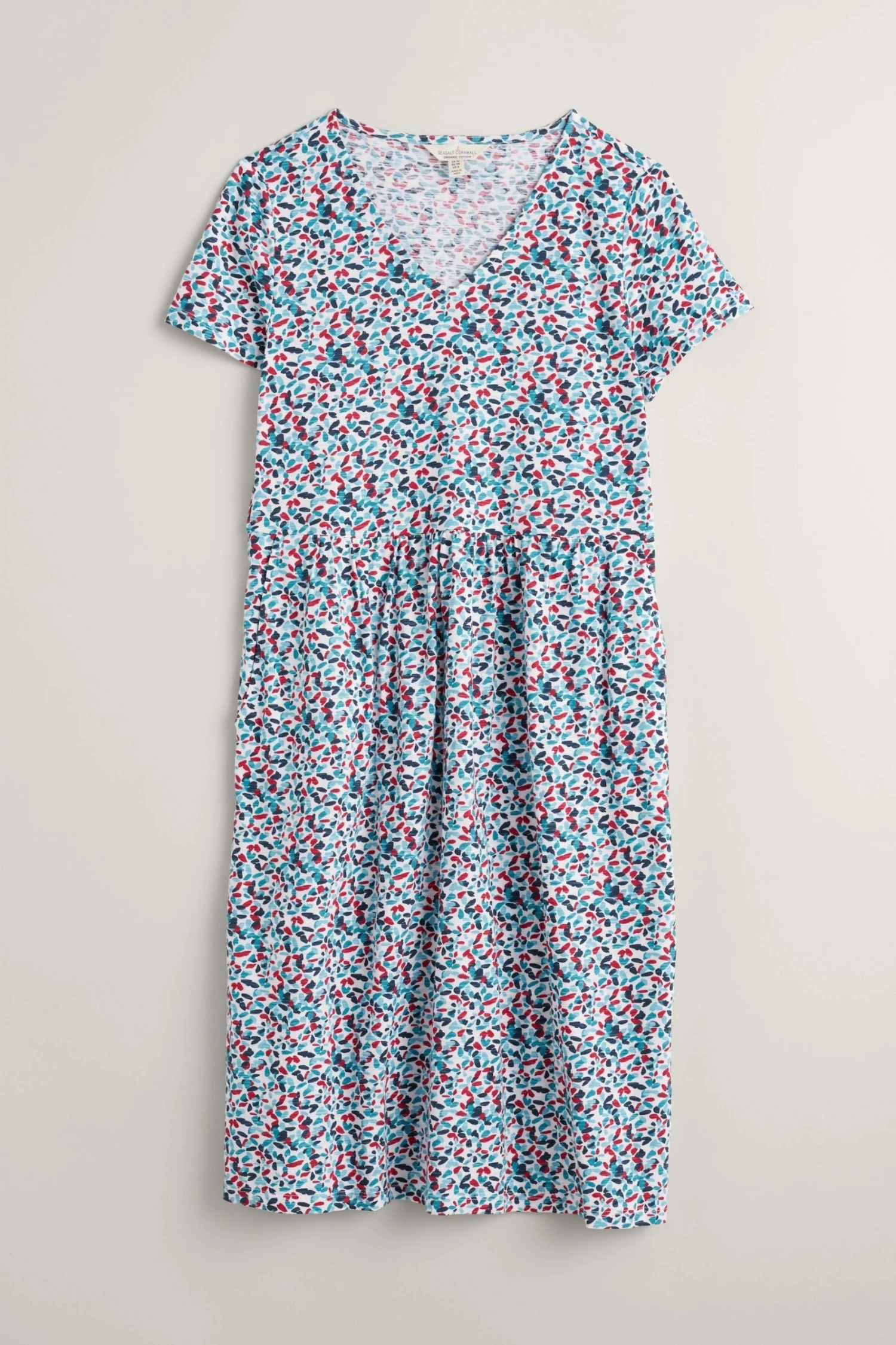 Easy, summer cotton jersey dress with a relaxed, gathered waist and short sleeves.