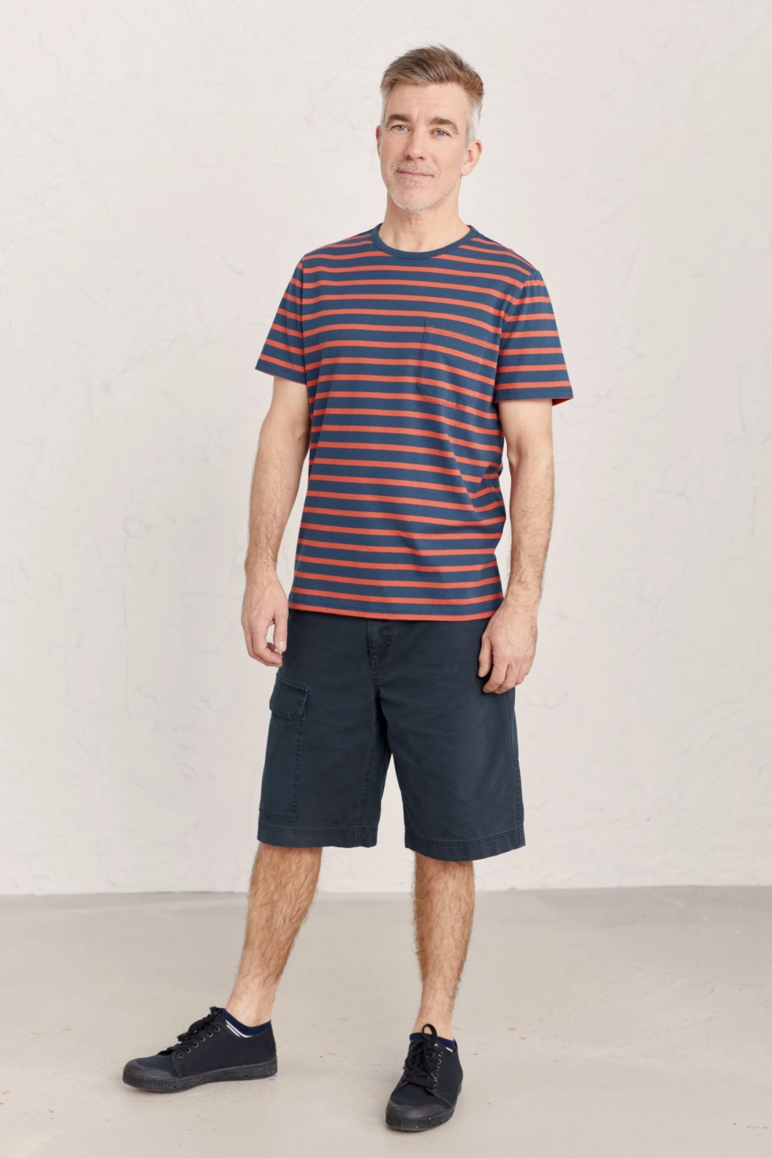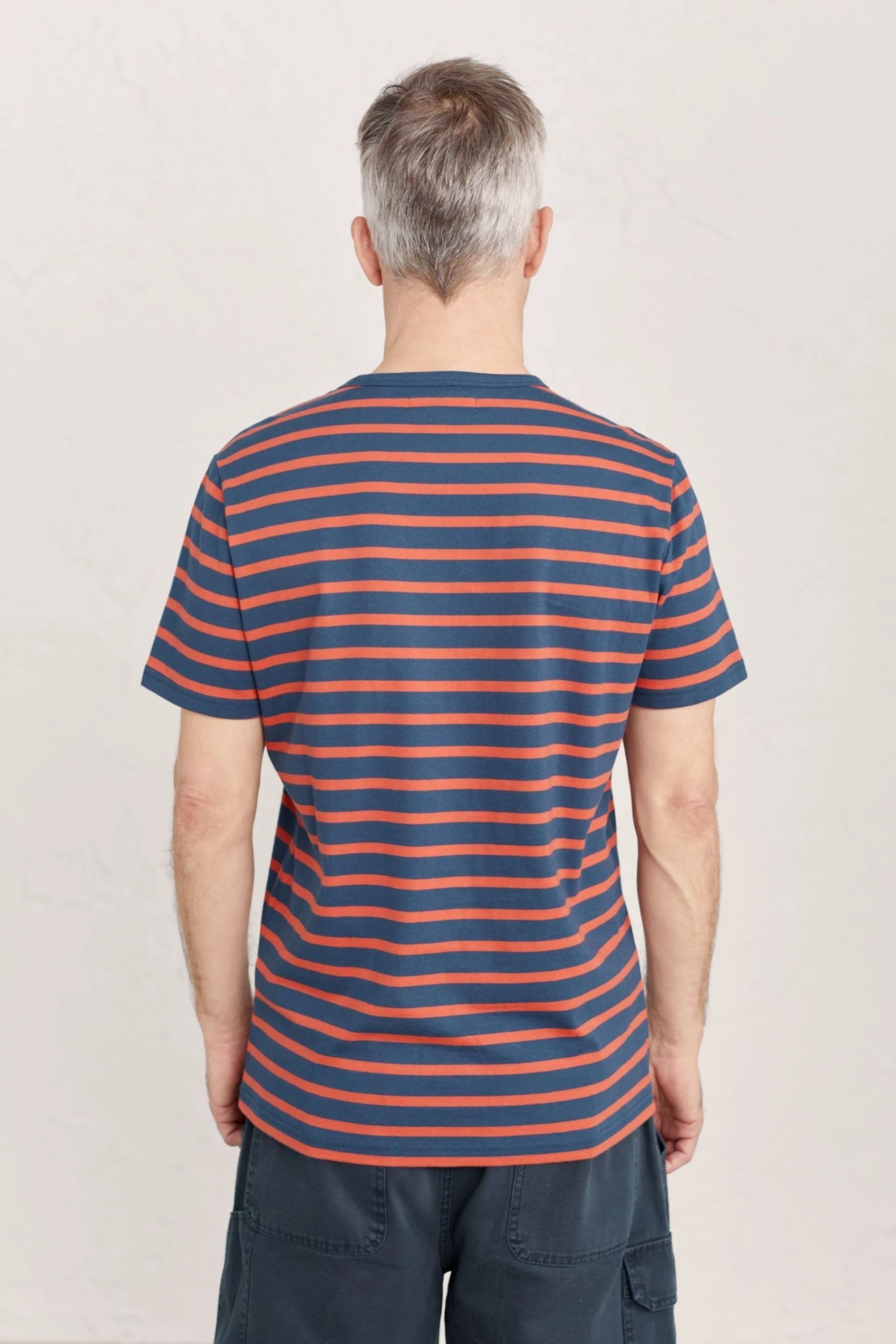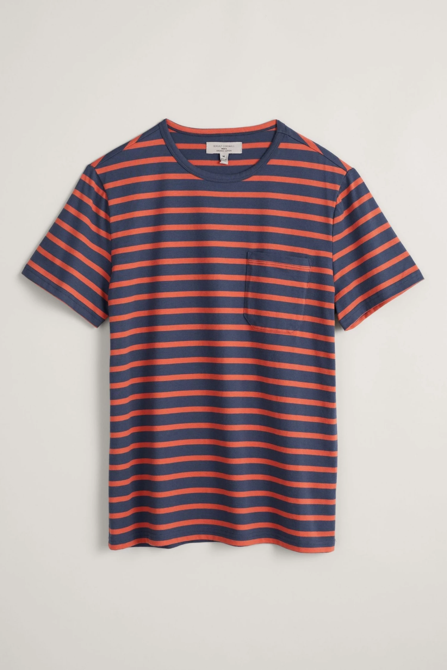 Organic cotton striped T-shirt with patch pocket and a vintage-style contrast neckline.