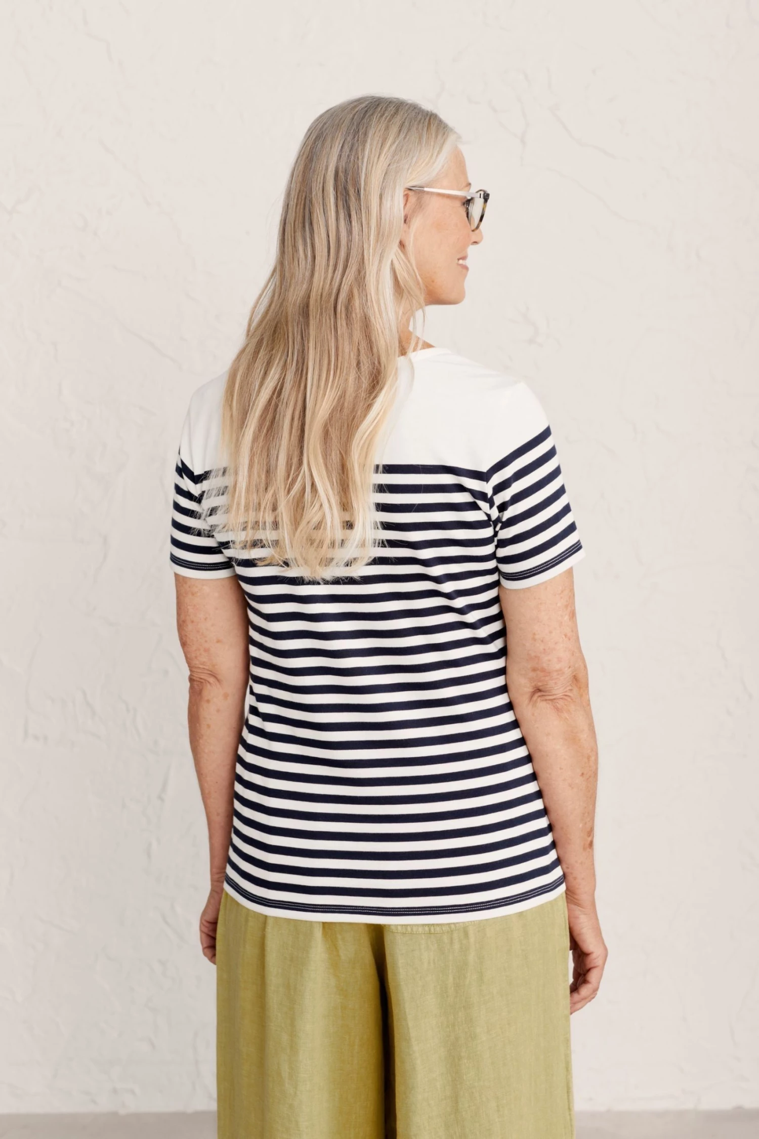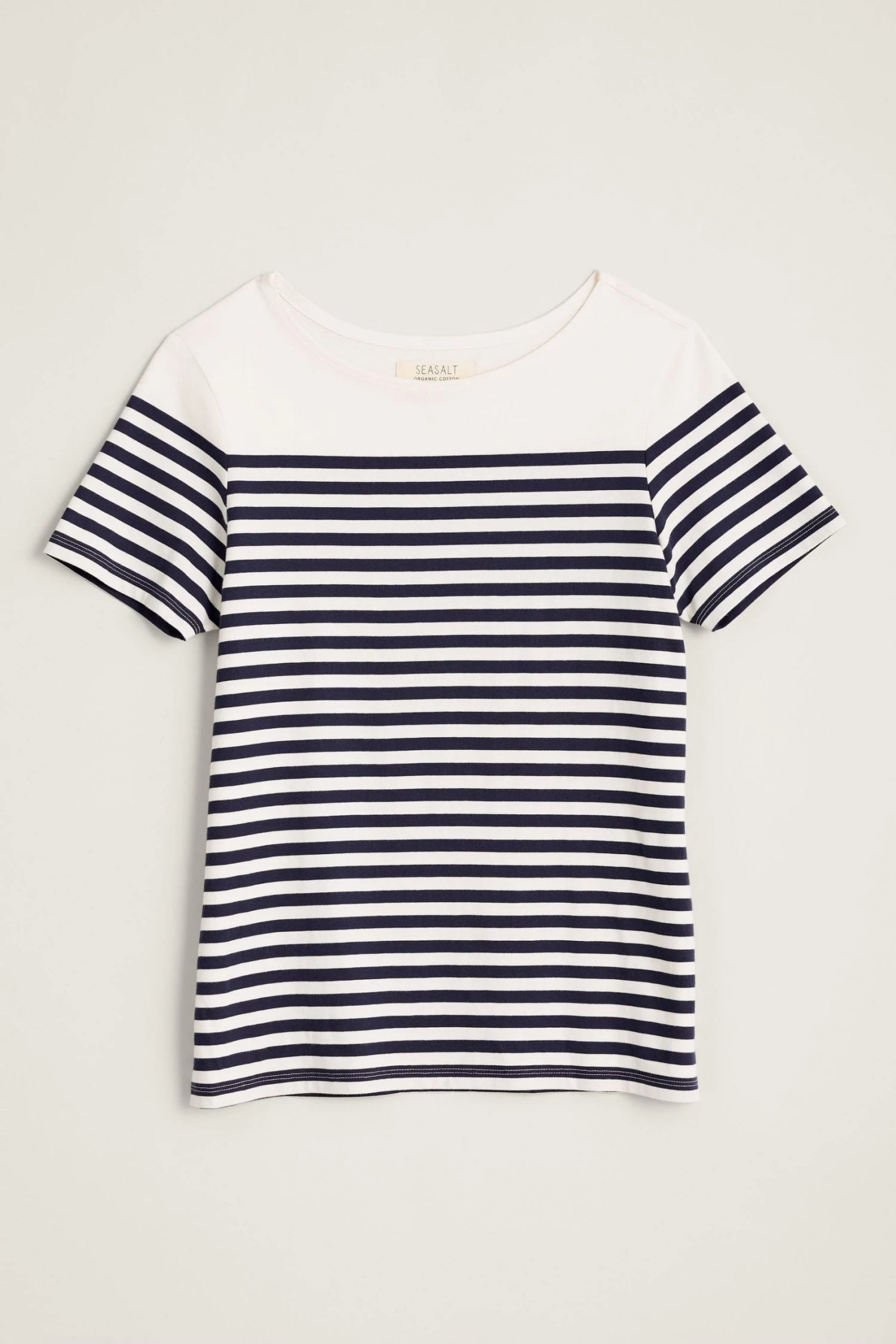 Semi-fitted, short sleeved t-shirt with wide, evenly spaced Cornish stripes in soft organic cotton jersey.