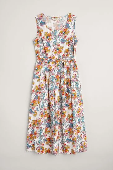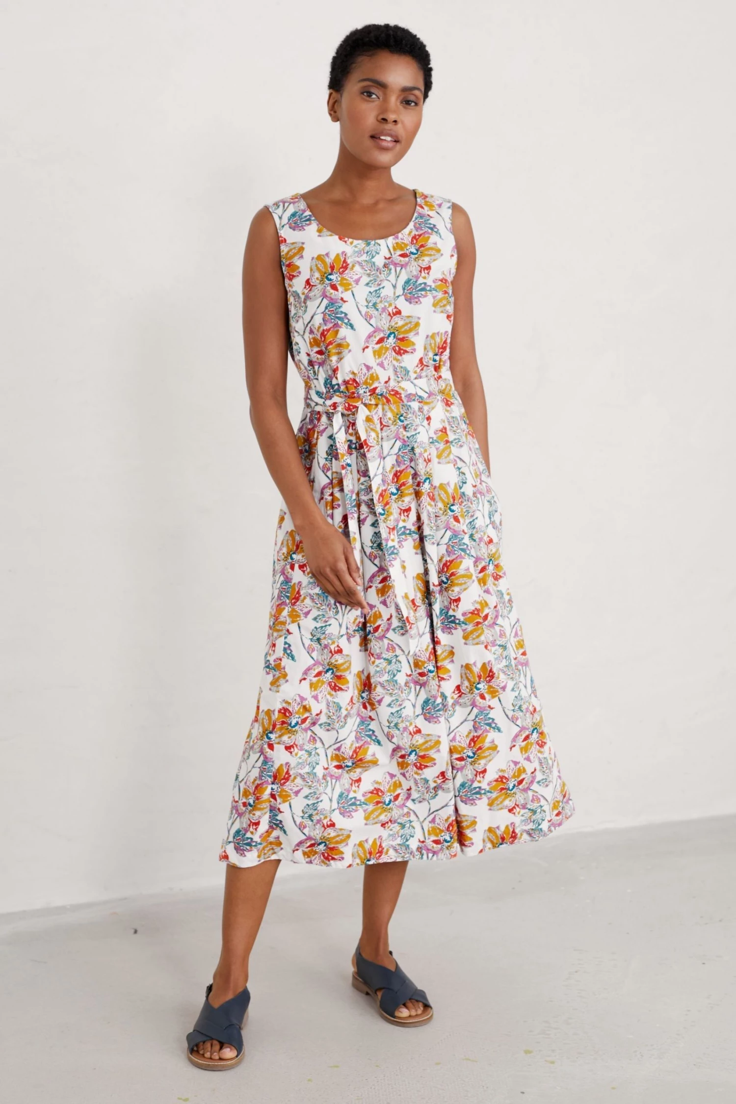 A midi-length dress, fit-and-flare summer style with a removable tieback and concealed side zip.