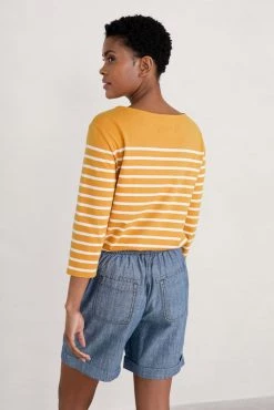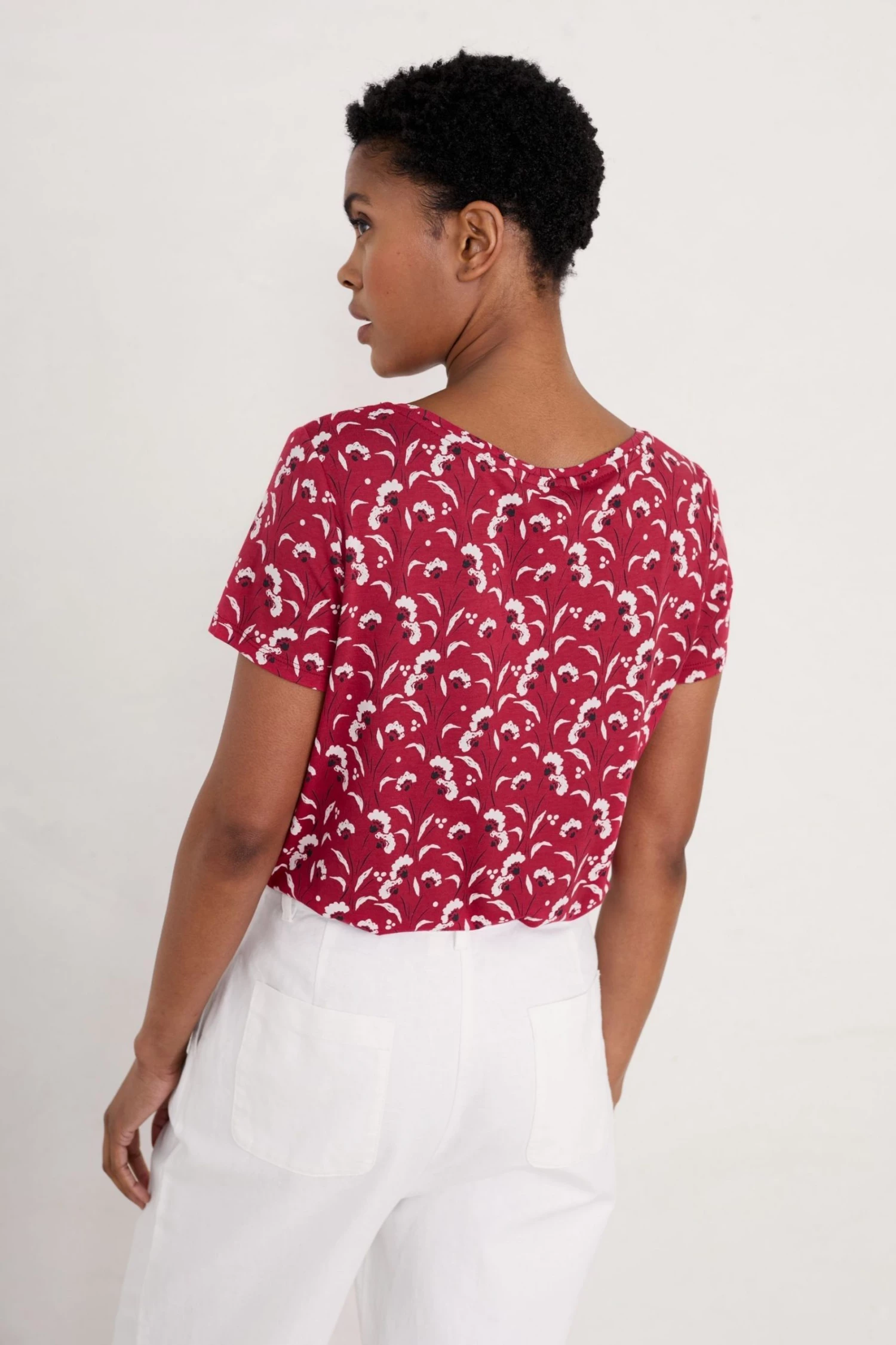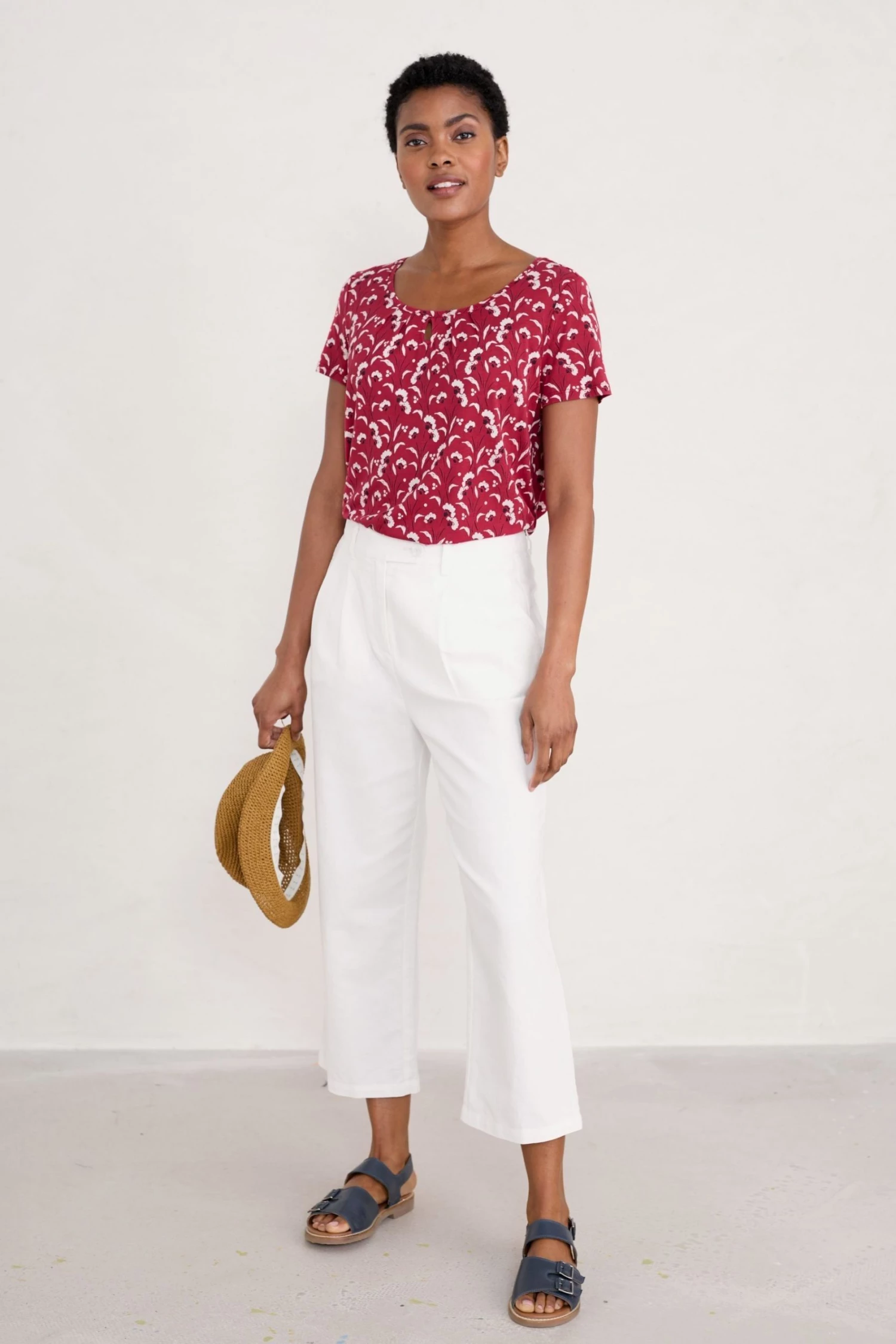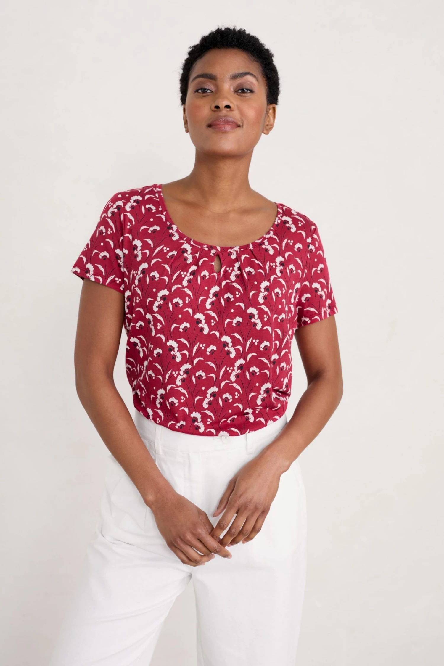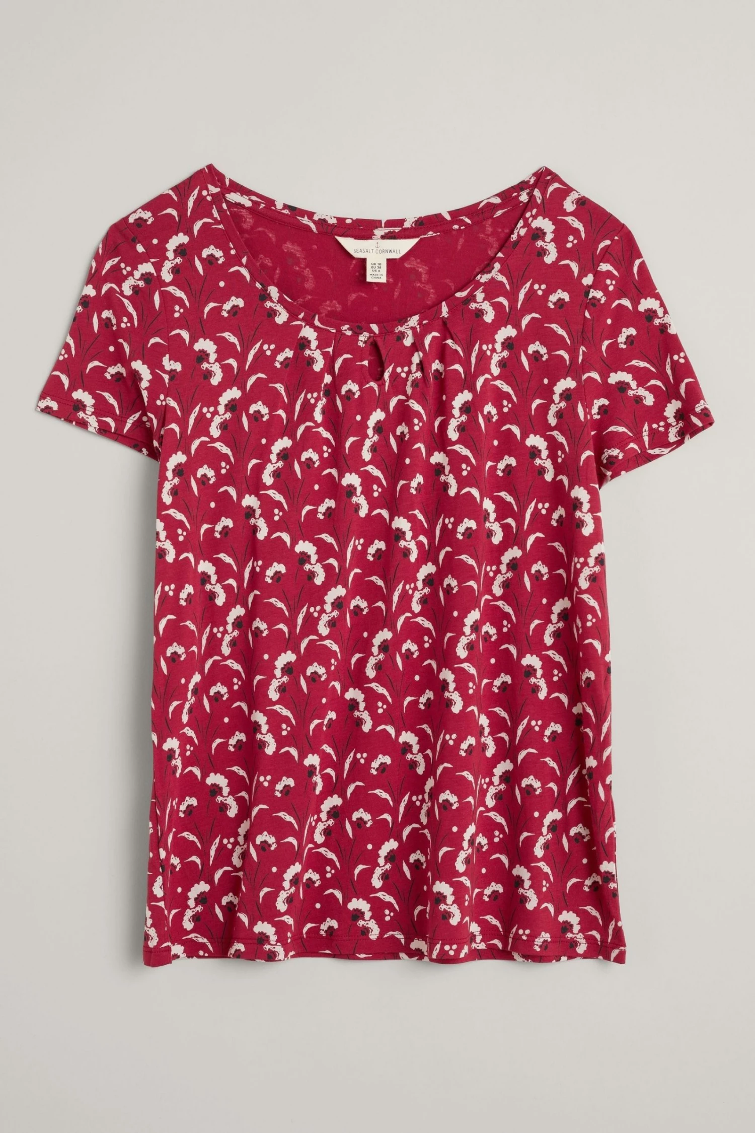 A top with short sleeves and a scoop neck, made from a soft and breathable organic cotton jersey in fresh coastal colours. Finished with a little keyhole detail and pintucks at the neckline. Choosing organic cotton helps to protect wildlife, workers and soil quality.