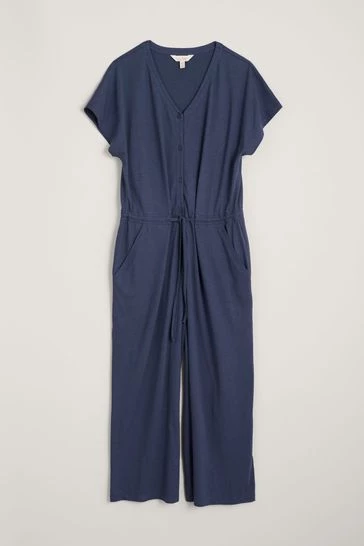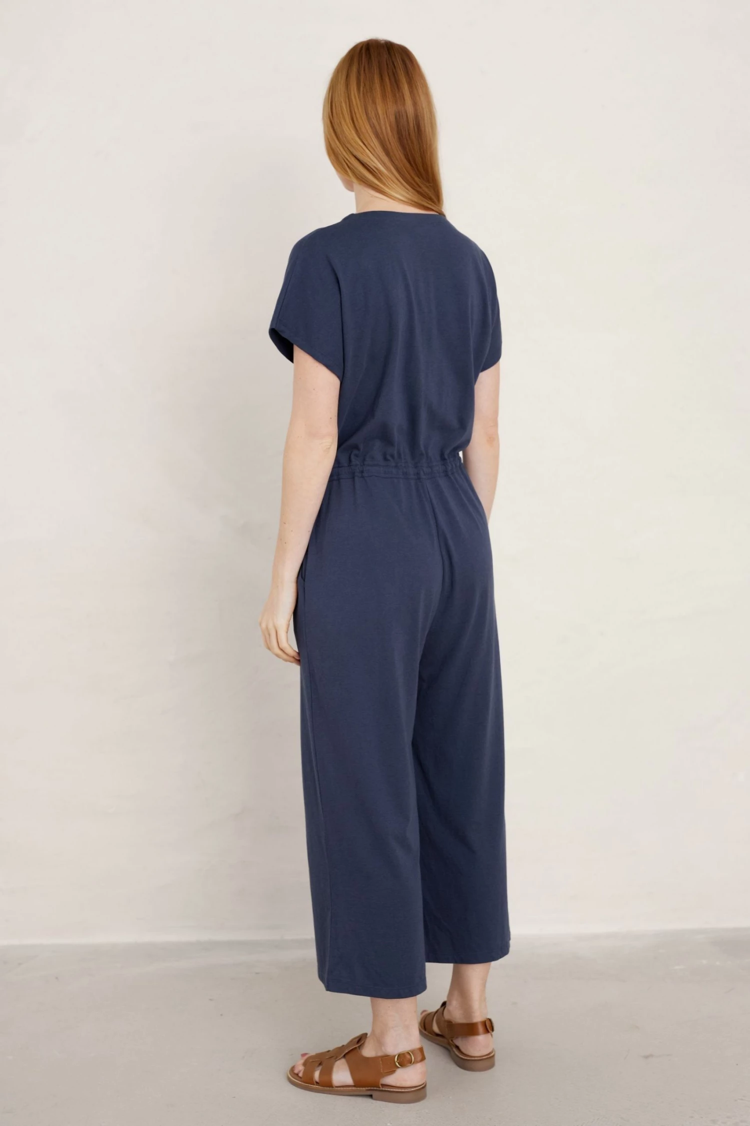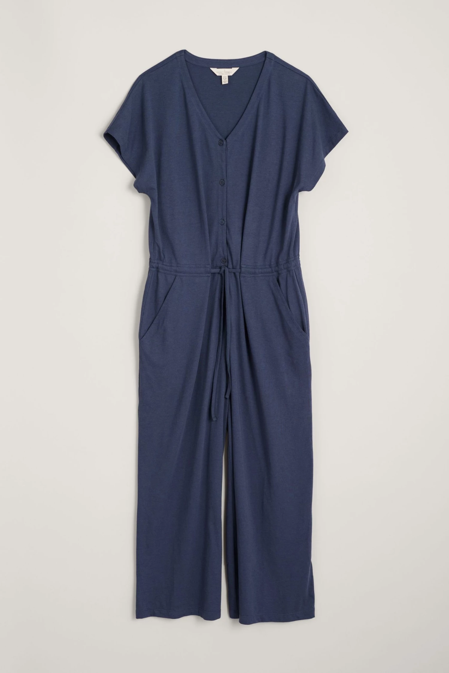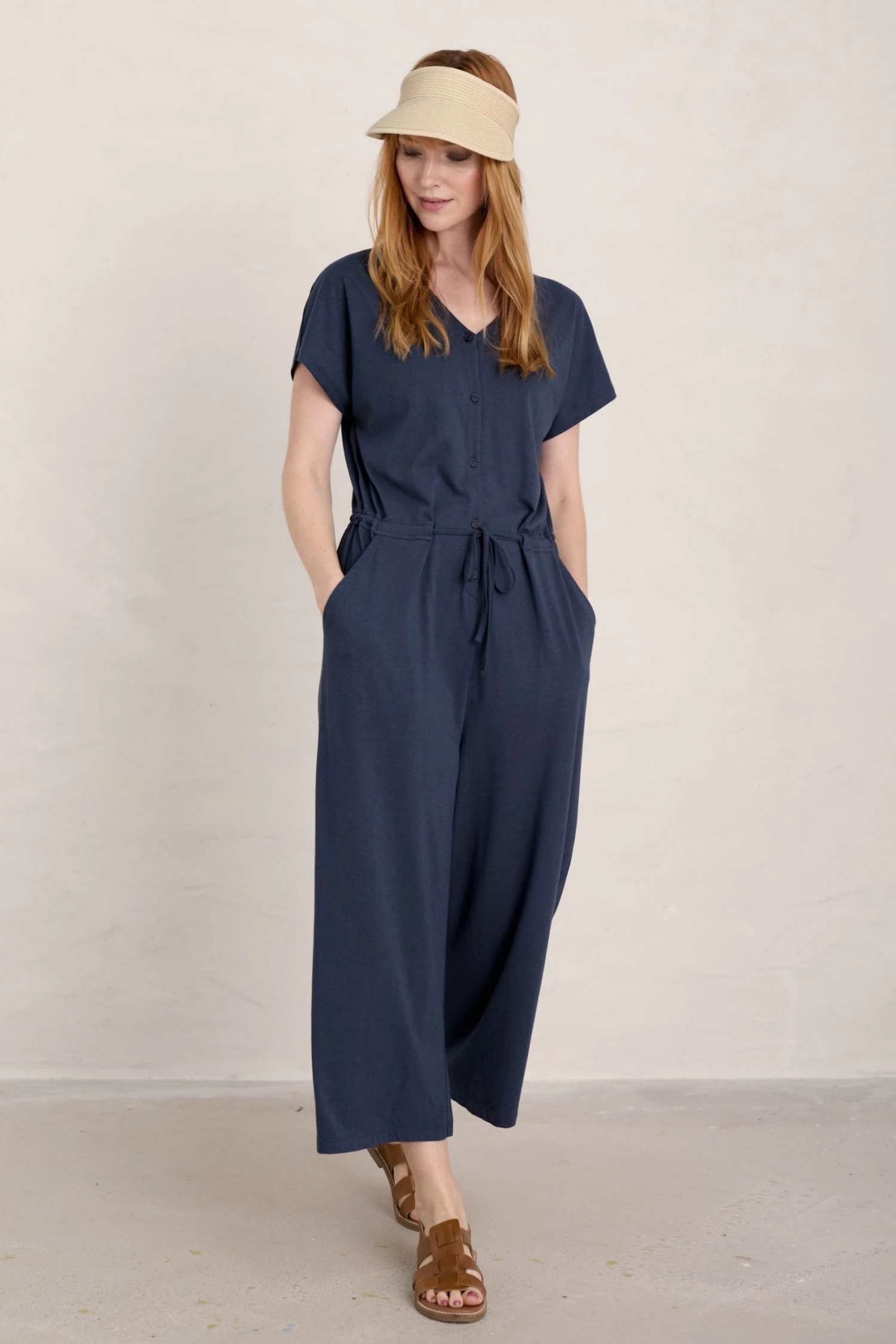 Summery, wide leg jersey jumpsuit with V-neck button top, in a unique Seasalt print.